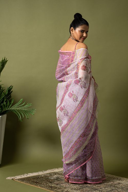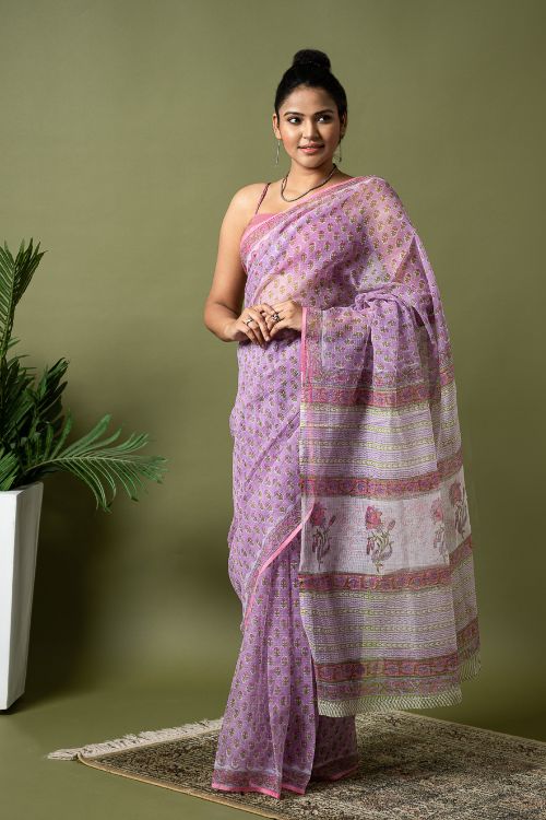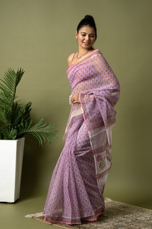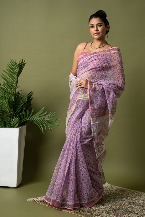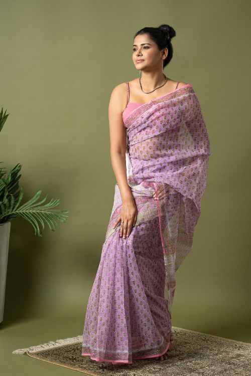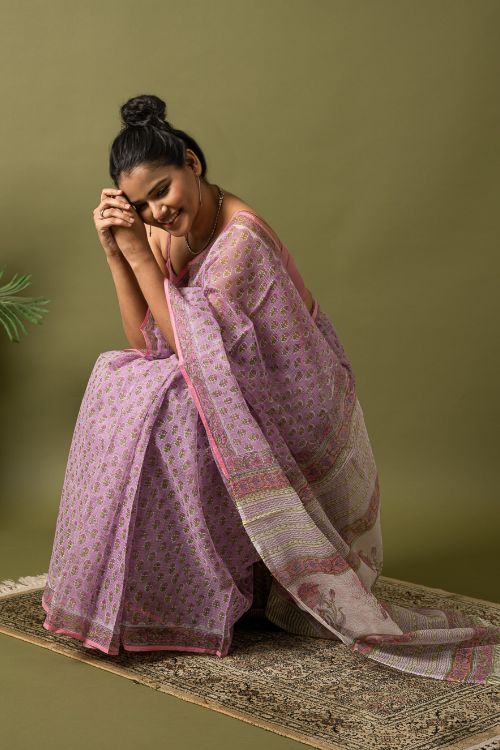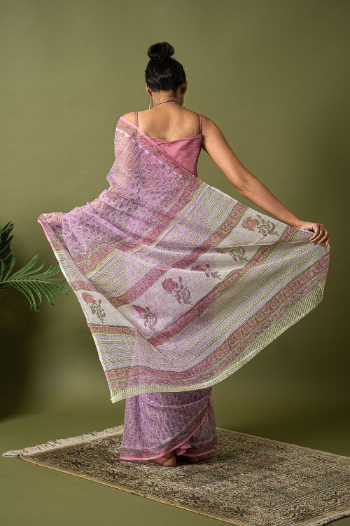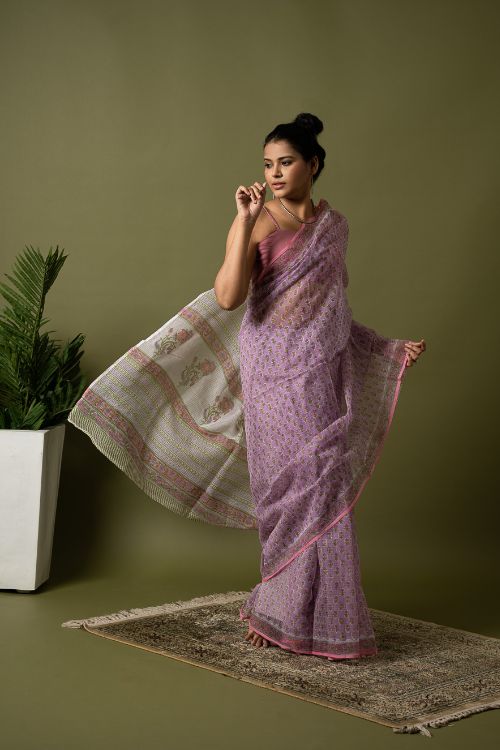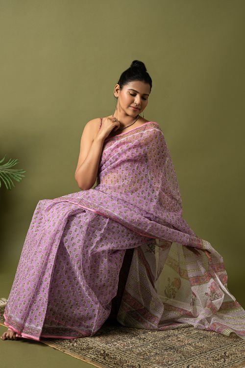 Mauve Flora.Hailing from the village of Sanganer in Rajasthan and inspired by the beauty of the ancient, exquisitely landscaped ‘Baugs’ (gardens), this 500-year-old print is characterized by the usage of pale, subtle and tranquil colours with intricate and quite often enlarged standalone motifs (buttas) dominated by a variety of flora such as poppies, lilies, marigolds and sun flowers. In Sanganeri printing, the outline is printed first, followed by the inner motifs. The Sanganeri block printers are famed for their impeccable sense of aesthetics, finesse and ability in harmonizing the background colour of the cloth to that of the print to near perfection. Sanganeri prints are believed to have emerged in the 17th century when an number of craftsmen of that era migrated to Sanganer in Rajasthan, which by then was a thriving center of sun-dried dyeing processes. The then royal families of the state were the earliest appreciators of the art and under their patronage the craft flourished by leaps and bounds.