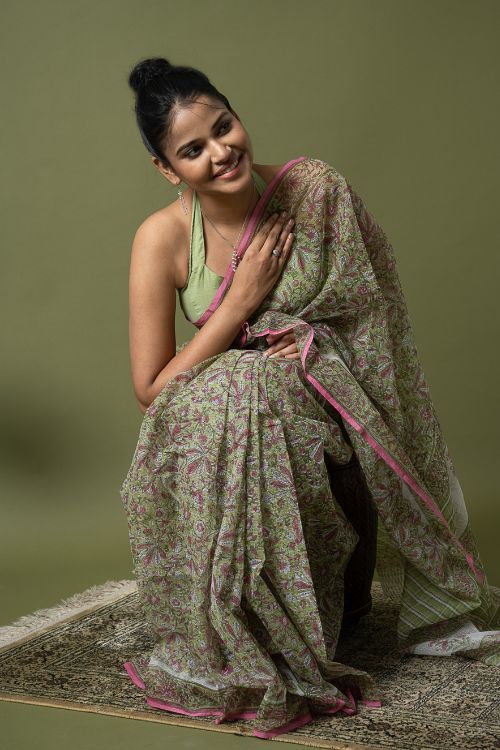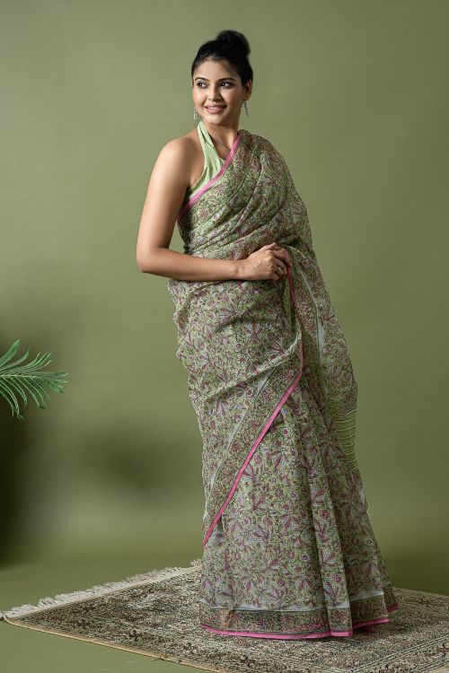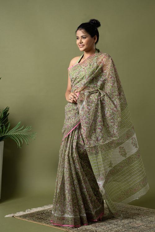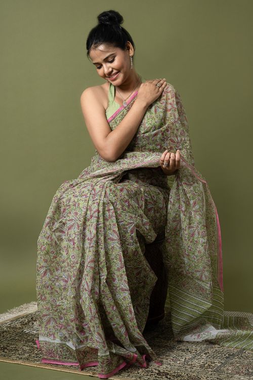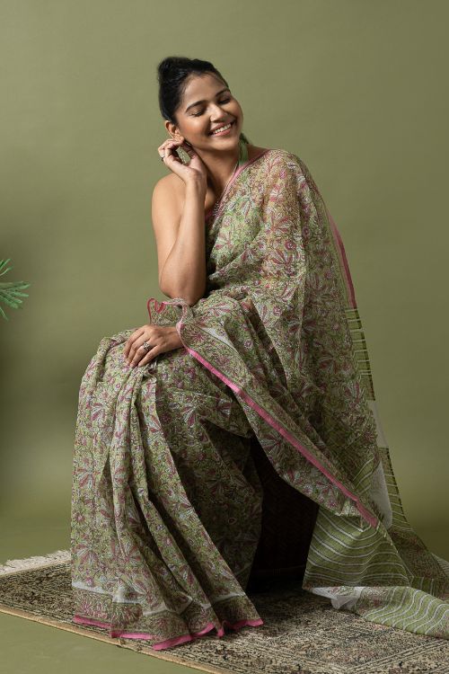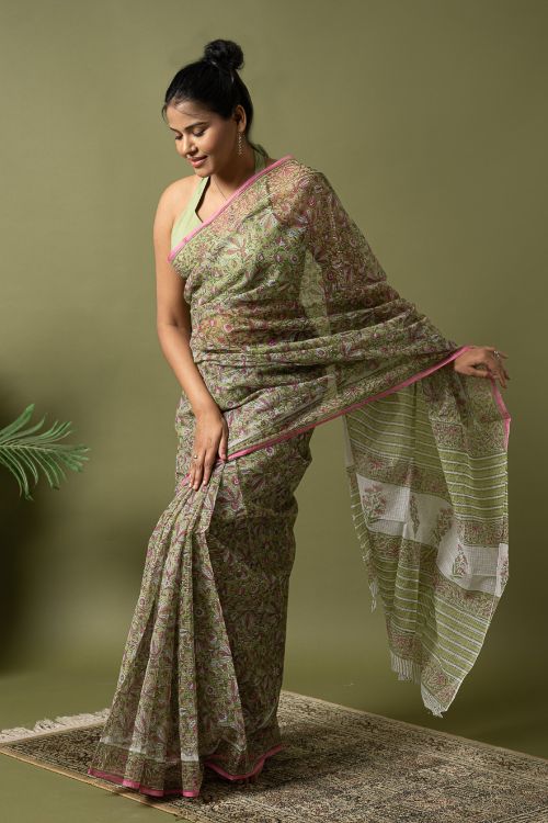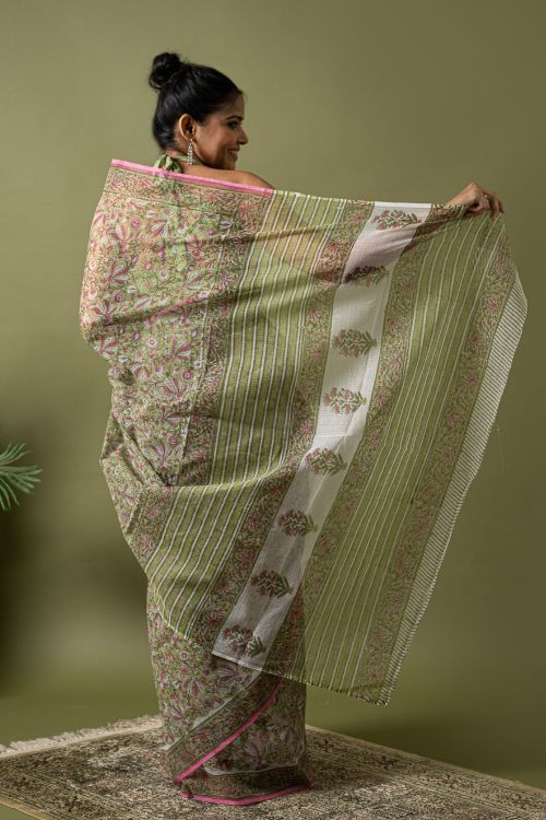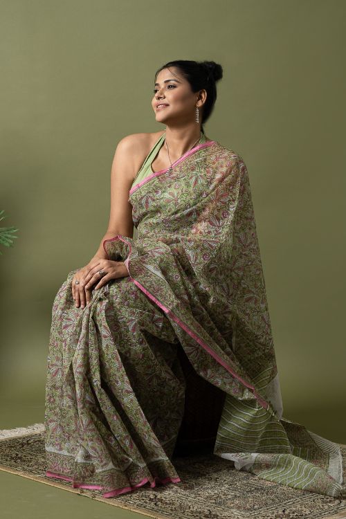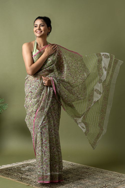 Soft Green Flora.Hailing from the village of Sanganer in Rajasthan and inspired by the beauty of the ancient, exquisitely landscaped ‘Baugs’ (gardens), this 500-year-old print is characterized by the usage of pale, subtle and tranquil colours with intricate and quite often enlarged standalone motifs (buttas) dominated by a variety of flora such as poppies, lilies, marigolds and sun flowers. In Sanganeri printing, the outline is printed first, followed by the inner motifs. The Sanganeri block printers are famed for their impeccable sense of aesthetics, finesse and ability in harmonizing the background colour of the cloth to that of the print to near perfection. Sanganeri prints are believed to have emerged in the 17th century when an number of craftsmen of that era migrated to Sanganer in Rajasthan, which by then was a thriving center of sun-dried dyeing processes. The then royal families of the state were the earliest appreciators of the art and under their patronage the craft flourished by leaps and bounds.