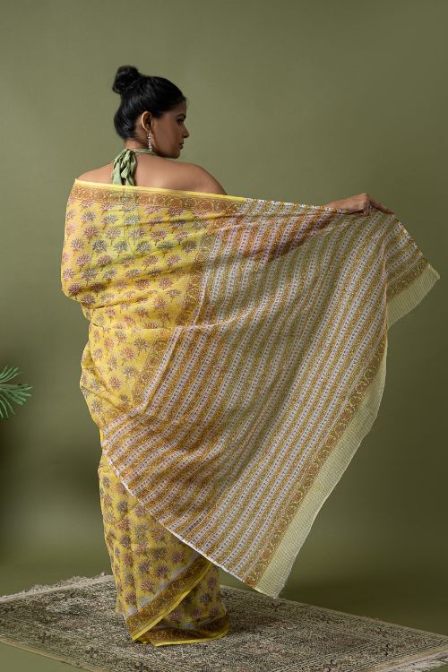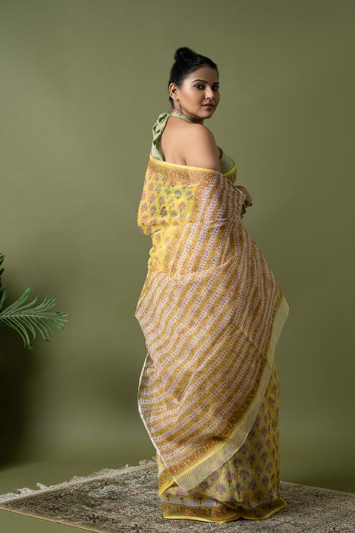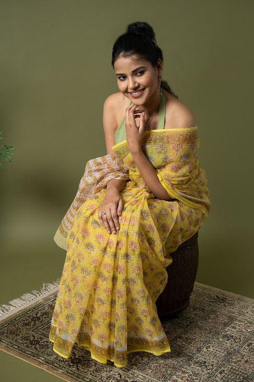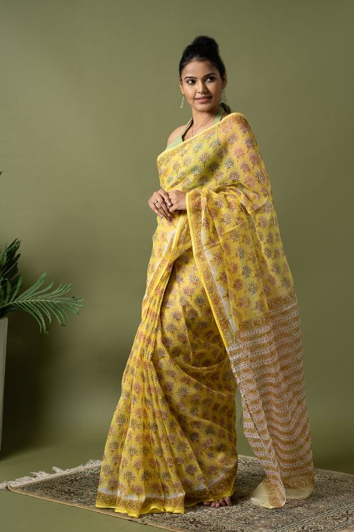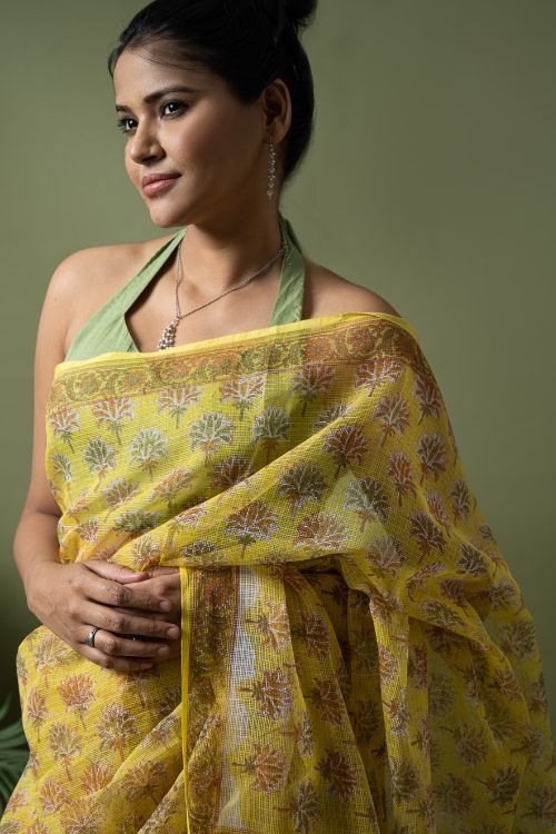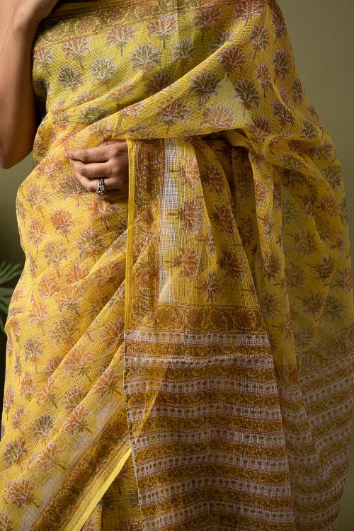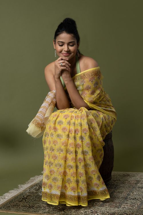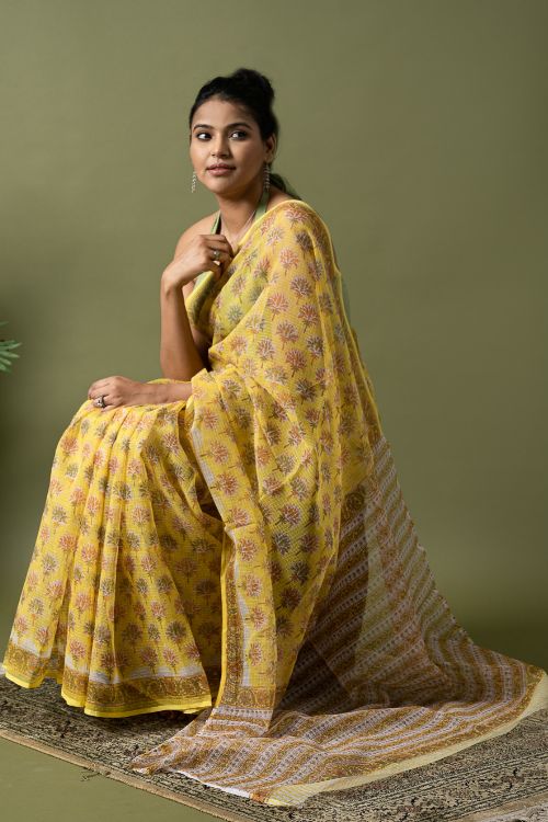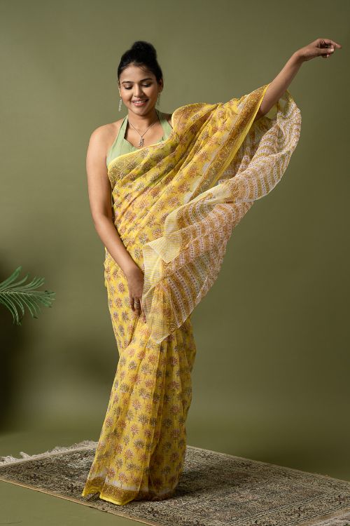 Yellow Flora.Hailing from the village of Sanganer in Rajasthan and inspired by the beauty of the ancient, exquisitely landscaped ‘Baugs’ (gardens), this 500-year-old print is characterized by the usage of pale, subtle and tranquil colours with intricate and quite often enlarged standalone motifs (buttas) dominated by a variety of flora such as poppies, lilies, marigolds and sun flowers. In Sanganeri printing, the outline is printed first, followed by the inner motifs. The Sanganeri block printers are famed for their impeccable sense of aesthetics, finesse and ability in harmonizing the background colour of the cloth to that of the print to near perfection. Sanganeri prints are believed to have emerged in the 17th century when an number of craftsmen of that era migrated to Sanganer in Rajasthan, which by then was a thriving center of sun-dried dyeing processes. The then royal families of the state were the earliest appreciators of the art and under their patronage the craft flourished by leaps and bounds.