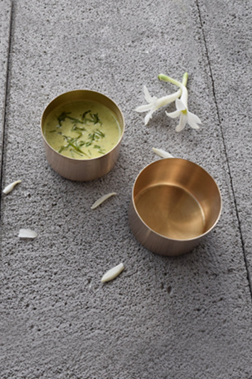 The Kansa Dip Bowls are a great addition to your entertainment table. Use them for dips, sauces, a bunch of tall finger foods or also as tealights. These dip bowls go very well with our range of serveware including cheeseboards, finger food platters and copper trays. Size: 2.5" dia x 1.5" ht