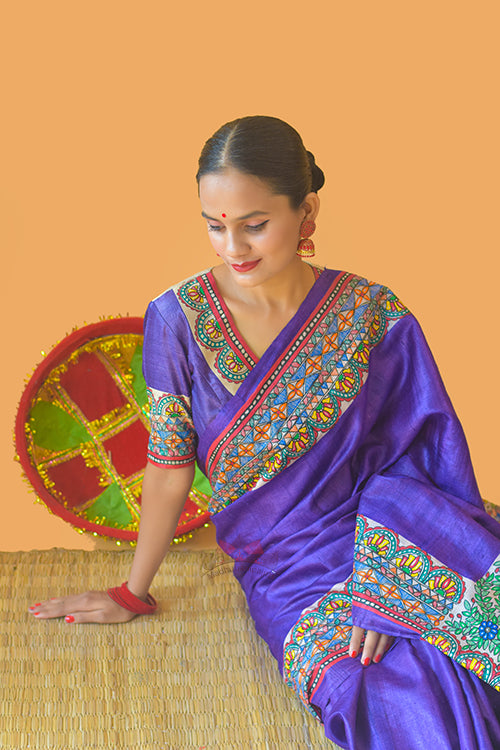 Authentic Handpainted Madhubani Handwoven Tussar Silk Saree. This saree has a depiction of matsya and mayuri utsav, a celebration of ecosystem of fishes in mithila pond and tiny lakes spread in the beautiful area, flowers, peacock and fishes are the highlight of the circular design on the aanchal. Borders are highlighted with madhubani borders. This saree will be made on order. Dispatched in a maximum of 35-40 days. Blouse worn by model in this picture is for photoshoot , this saree comes with running blouse fabric with minimal artowork on it.