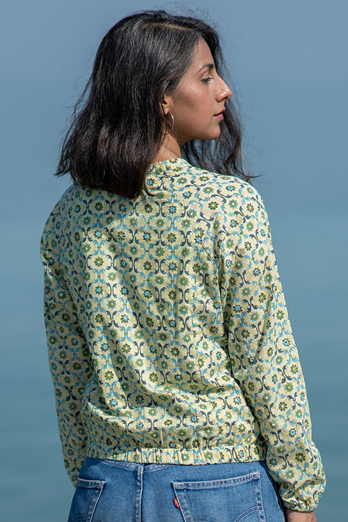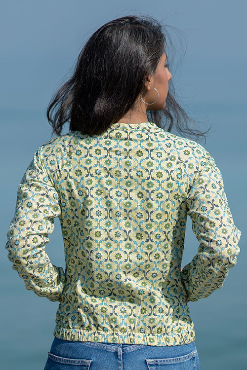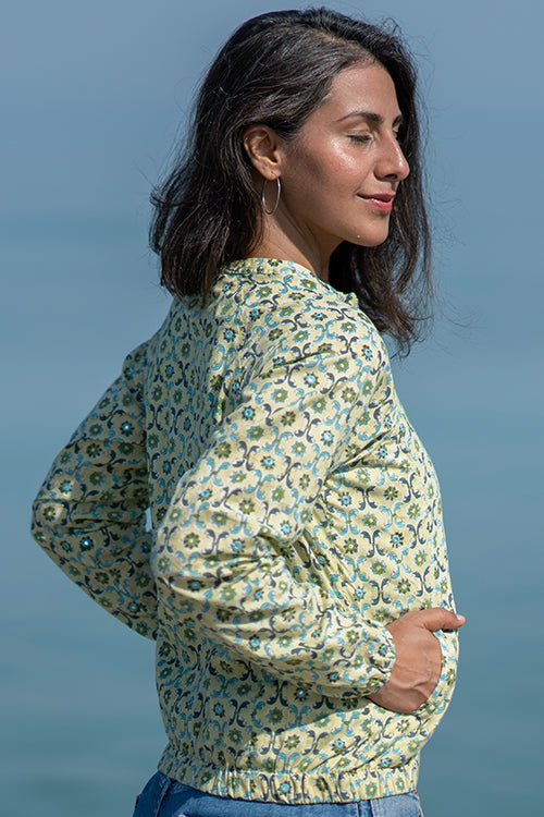 Okhai 'Melancholy' Pure Cotton Hand Block Printed Mirror Work Bomber Jacket