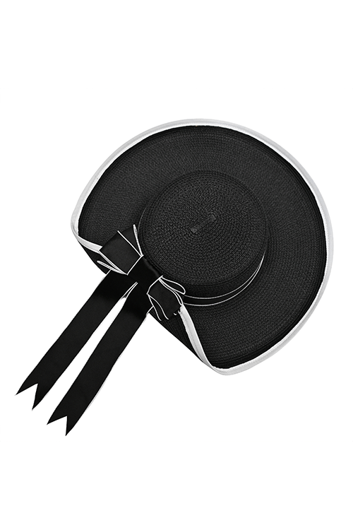 Meet the Puffin Hat by Myaraa — a luxurious statement boater hat that redefines summer sophistication. Co-designed for the modern muse who appreciates handmade, designer hats with a refined edge, this black vegan hat is trimmed with crisp white piping and finished with an elegant oversized bow and twin ribbon tails.