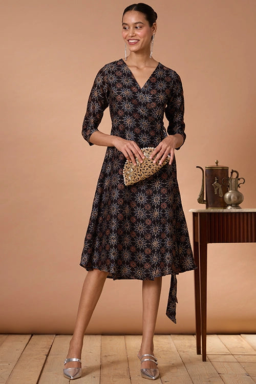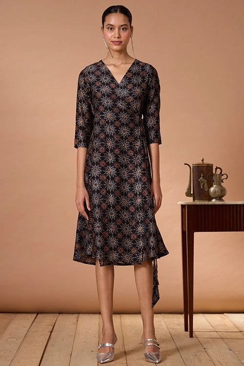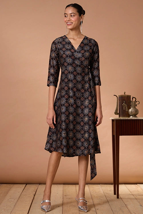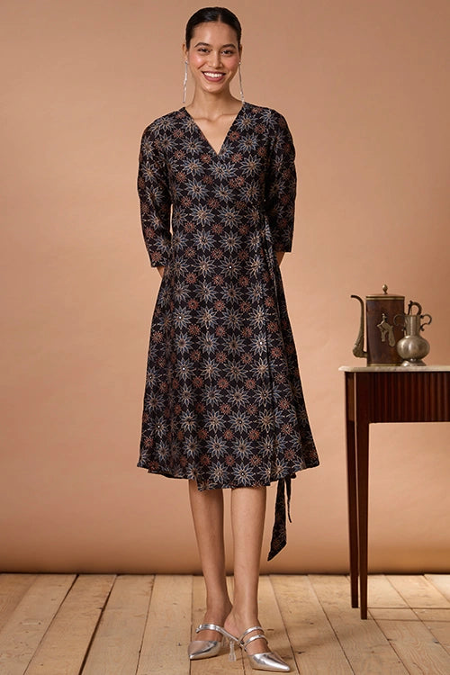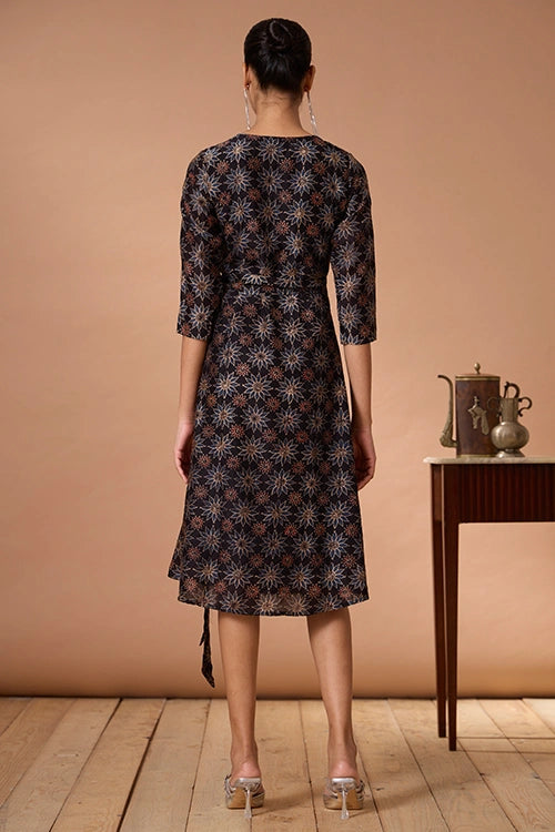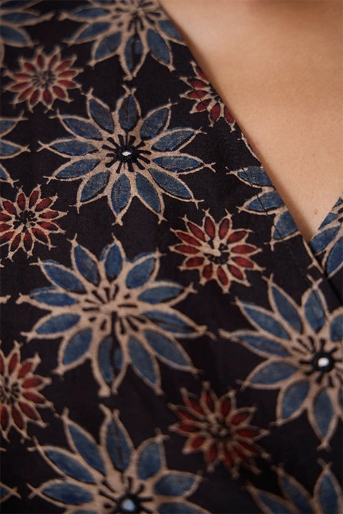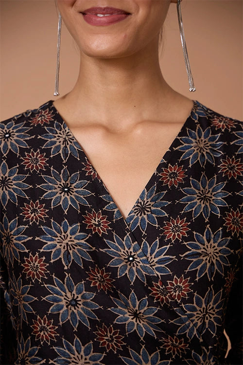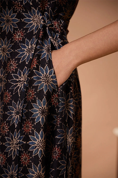 We always need a quick, effortless but elegant outfit for one of those festive days, and we have got the right pick for you too- our "Neelam" Chanderi Silk Wrap Dress. An ode to the passed-down practice of Ajrakh printing, the rich black fabric has splendid floral motifs all over it. It comes with soft Mul Cotton lining underneath for your comfort. Giving character to the floral motifs are the hand-embroidered mirrors at the centre of each flower on the front panel. And worry not, we have your back as this wrap dress comes with a pocket on the side. A playful take on festive wear, wrap around "Neelam" and twirl away!