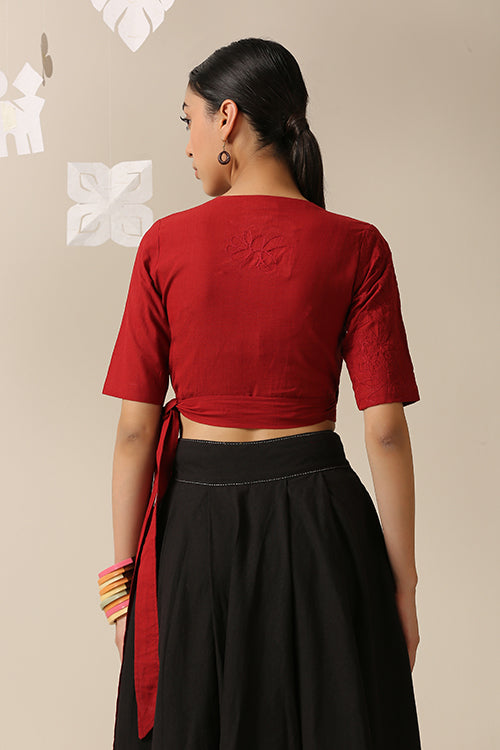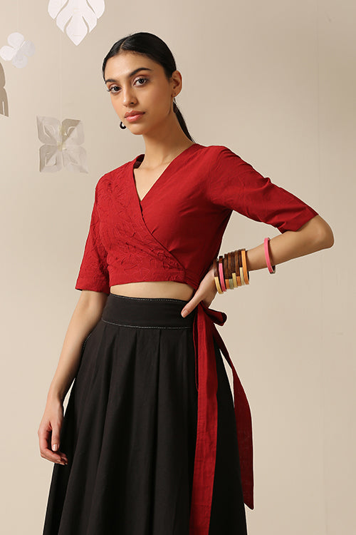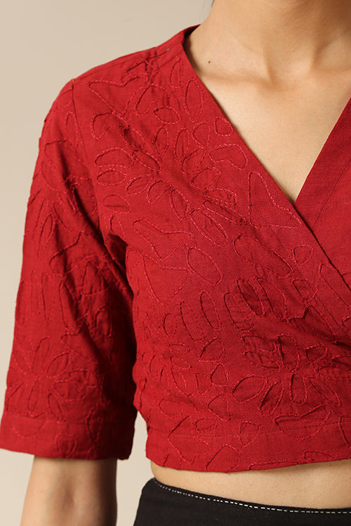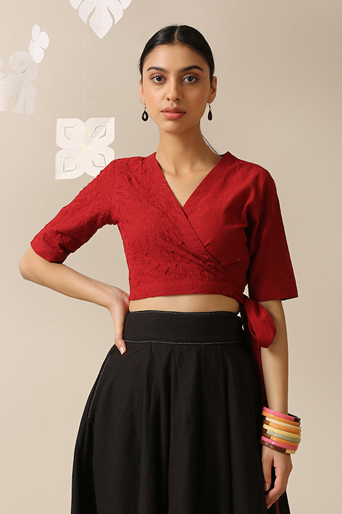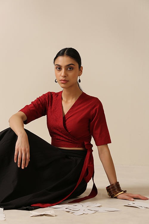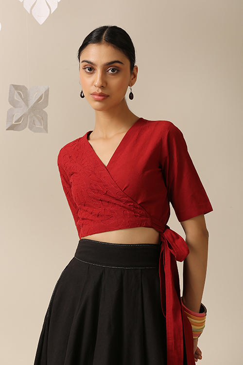 The art of applique work is native to several regions in Gujarat, it is believed to have its origins in French culture. The beauty of this technique allows for the creation of radically different textures and creates appealing minimalistic designs. Say hello to Chinar. 'Chinar' is a very special applique work wrap top. It's simple yet very fun and different. Made with light cotton fabric, this wrap features stunning reverse applique with uneven tiny motifs highlighted with a running stitch on the front panel stretching up to the sleeve on the same side and a small motif at the back. Whether you pair it with jeans or shorts, we think it will work well in any situation.