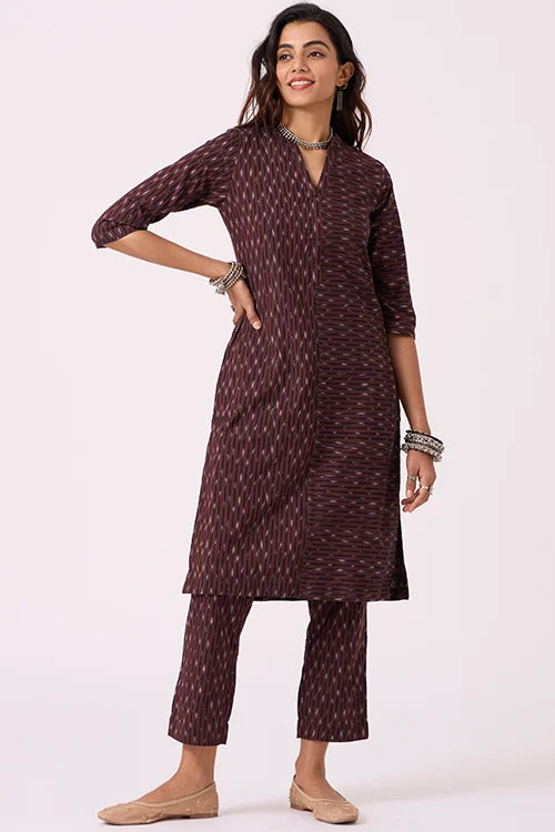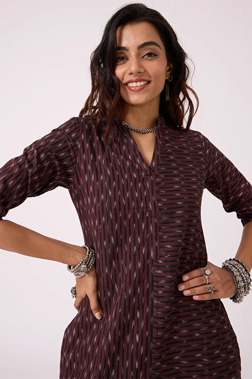 The Okhai ‘Coffee’ Ikat Kurta Set is a piece of ease and elegance. In earthy tones and breathable handwoven cotton, the kurta plays with asymmetry: vertical stripes on one side, horizontal on the other and the sleeves — a subtle twist on classic Ikat. Paired with tailored coffee-toned pants featuring pockets and a gently elasticated waist, it’s comfort with intention. Perfect for thoughtful mornings, creative meetings, or calm, confident days on the go