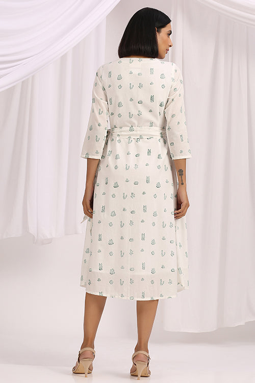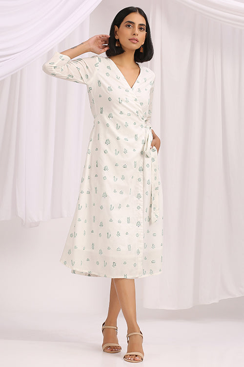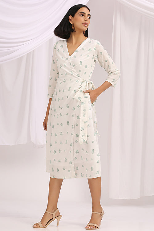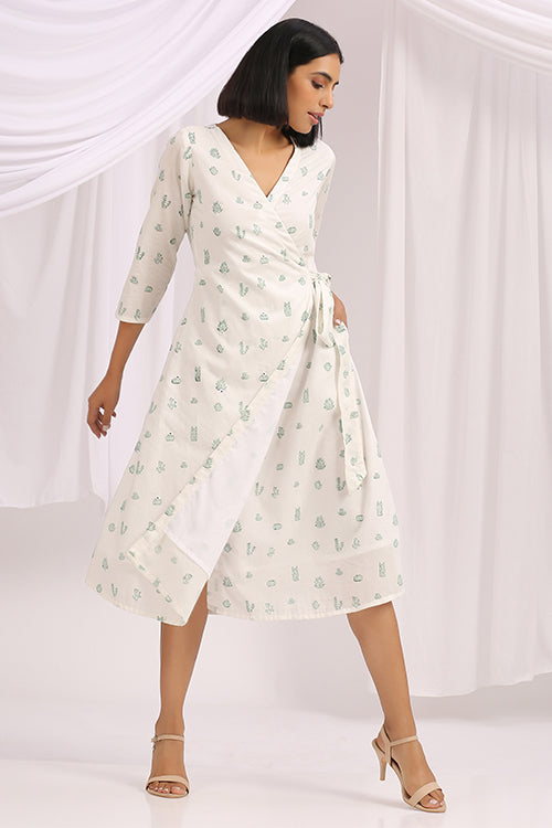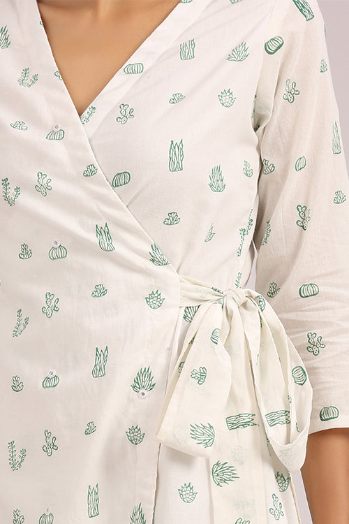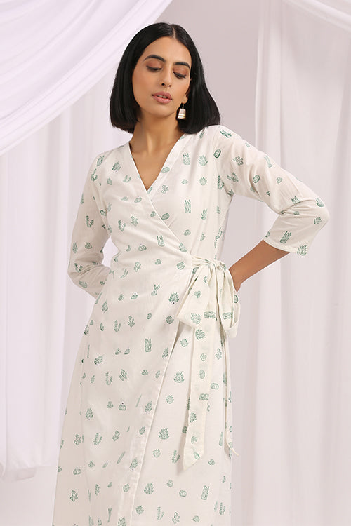 Handcrafted in a soothing white cotton fabric; Floralicious is a versatile wrap dress, specially made for you to make you feel everything sunshine and nature. It is delicately hand block printed with intricate cacti motifs scattered all over. For an elevated design, the dress is also adorned with mirrors on the panel. Without forgetting about comfort, we have added a buttery soft mulmul based lining underneath the dress. A special feature about this piece is that you dress tight or loose according to your pleasure; it will absolutely make the fit look flattering either way. Pair it with a pair of kitten heels and you're good to go for brunch with your family!