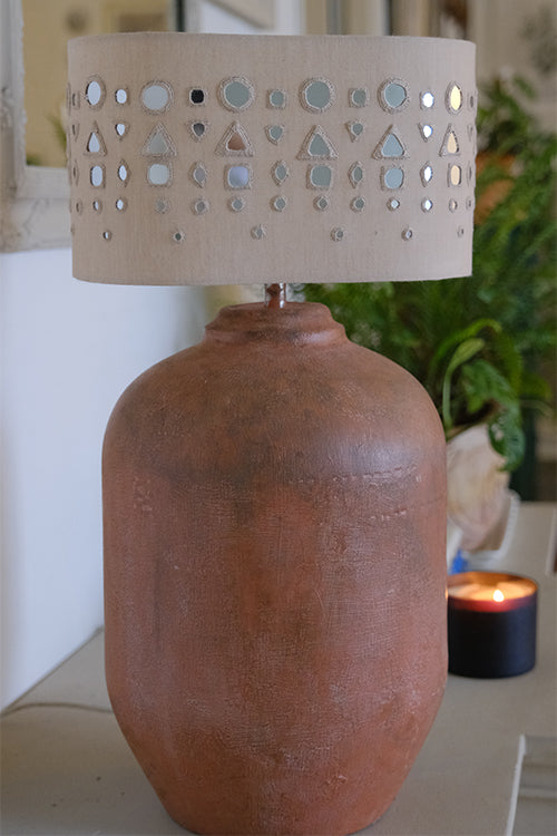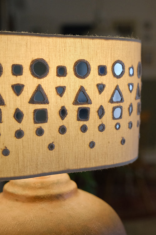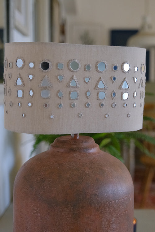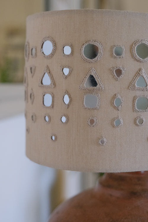 Radiating a sunny glow reminiscent of desert landscapes, the "Great Rann" lamp stands in a league of its own. Its uniquely oblong shade is crafted from pure cotton beige fabric, exuding elegance. The lamp's focal point is the array of magnificent mirrors in various shapes, each hand-embroidered by our skilled artisans. Infused with cultural essence, it blends seamlessly with any existing decor in your home.