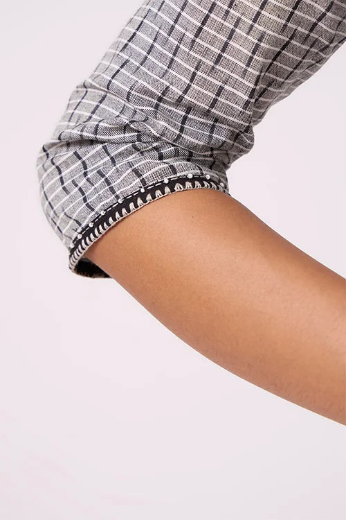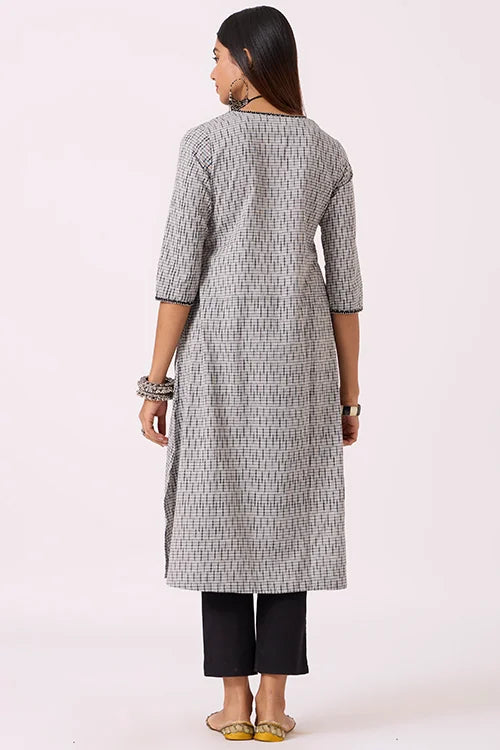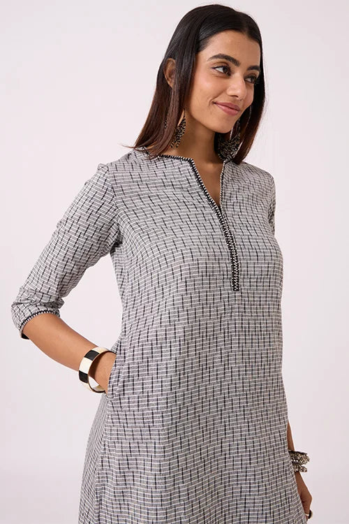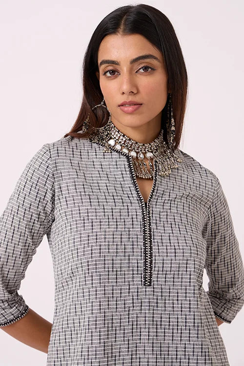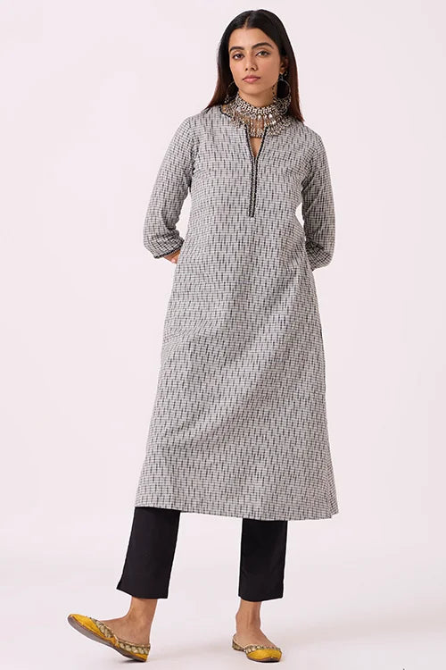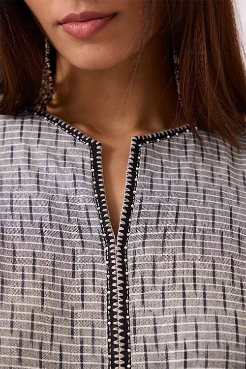 Crafted in soft grey Ikat weavel, this Ikat long kurta features refined black piping on the front and back neckline as well as the sleeve edges for a clean contrast. Adding to its charm is intricate embroidery—triplet buttonhole stitches followed by a line of running stitches, delicately accented with white beads along the neckline and sleeve edges. With two thoughtfully placed pockets, this relaxed kurta strikes the perfect balance between elegance and utility, ideal for both everyday wear, quiet dinners or slow weekends and special gatherings.