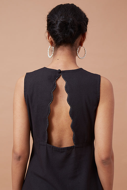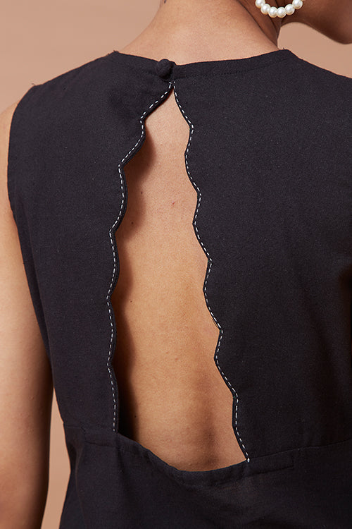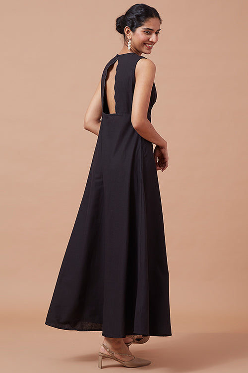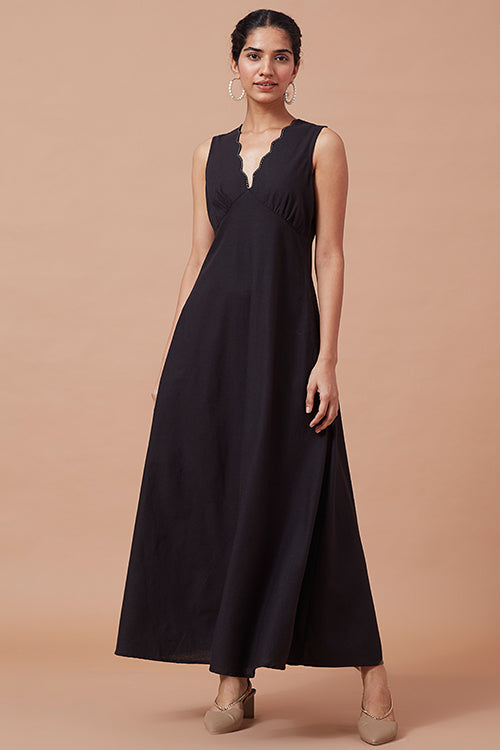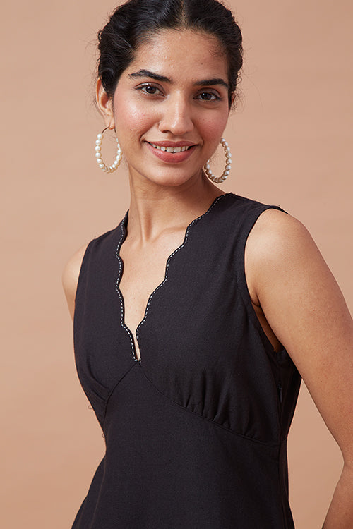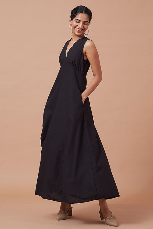 Our very special 'Impulse' is here to take your breath away! A very elegant silhouette with a V-shaped neckline with double layered scallops curve edge, and an upside-down V-shape neckline at the back, 'Noctiphany' will sway you away with its natural beauty. The neckline is highlighted with a running stitch to elevate the complete design. Coming with pleated gathers at the bust makes the fit even more flattering. That's not all, for a more comfortable yet perfect fitting to the body the dress comes with a concealed zipper on the left side and has shoulder loops for straps. To avoid distractions from your phone, keep it in the pockets provided with the dress. Don't forget to pair the dress with delicate gold accented jewellery for a soft yet stylish look and a pair of kitten heels, you will surely sway your partner with your charming dinner date look!