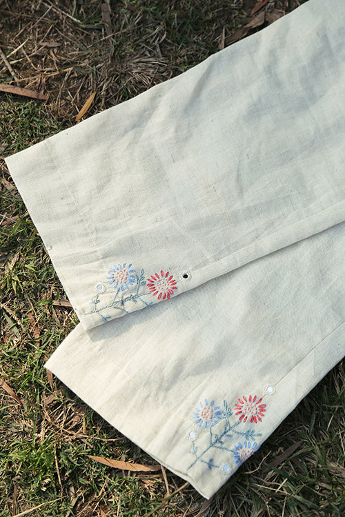 "Embrace the timeless beauty of a pearl as you gracefully radiate in our 'Ivory Pearl' kurta pant set, made to flatter. The kurta is delicately embroidered with flowers on creepers with stem stitch and laisy daisy stitch. It is furthermore glammed up with shimmering mirrors in the centre of the flowers in the front yoke and at the back. The sleeves are also carefully adorned with scattered flowers that add an elegant touch to the ensemble. The high slit kurta is handcrafted to provide you with supreme comfort while allowing you to adjust the fit per your liking with the inside shoulder loop for the strap with press buttons. Flaunt the intricate embroidery of petite flowers at the bottom of the pants. Whilst making a style statement, the pants also take care of your comfort by providing you with an elastic at the back, two concealed pockets and a drawstring. Dress it up or down- you can style it in so many ways.