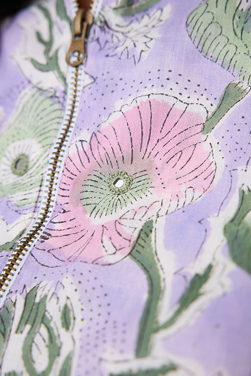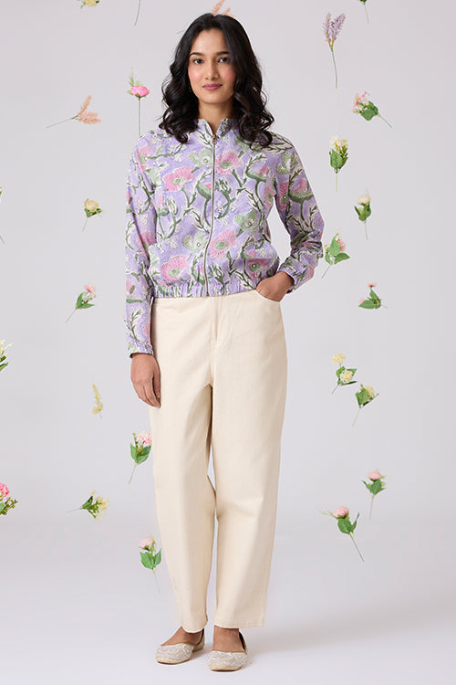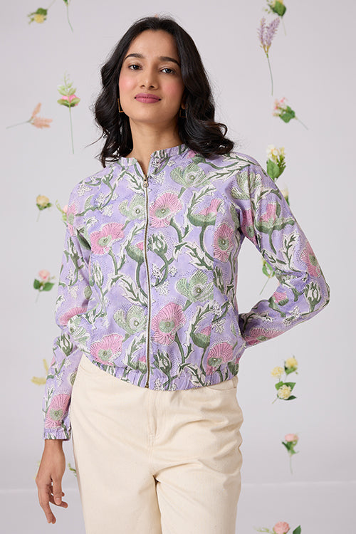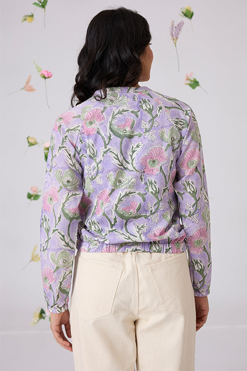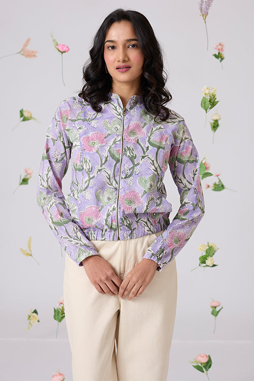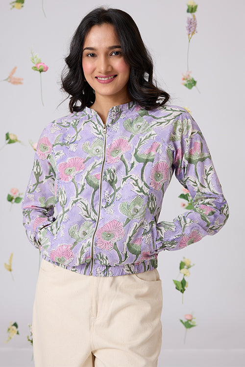Okhai "Lavender Love" Hand-Embroidered Mirrorwork Handblock Printed Pure Cotton Bomber Jacket