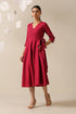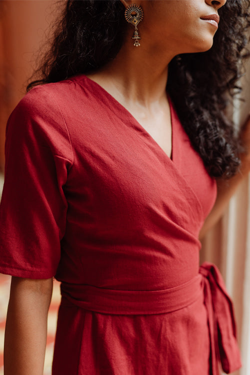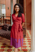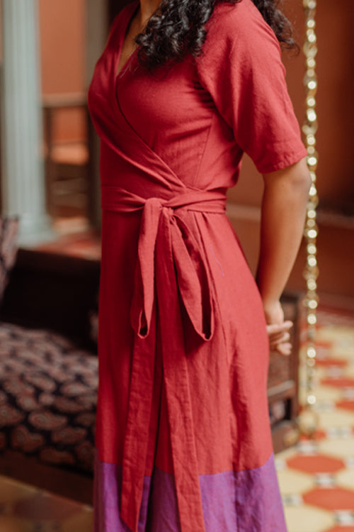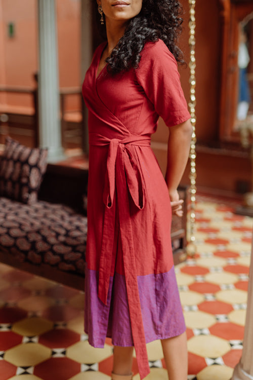 This dual coloured beauty is what you’ve been missing. Okhai’s ‘Masakali’ wrap-around dress is crafted with the utmost care in pure cotton fabric, ensuring the best comfort. A smart colour-blocking for a smart look, enjoy this combination of maroon and violet. Pick this breathable dress for a full day of work or for an evening get-together with friends. Wrap it around as per your convenience to accentuate your waist. This piece comes with one pocket for your needs. Pair is with block heels or flats, a sling bag, and set out to have a wonderful day.