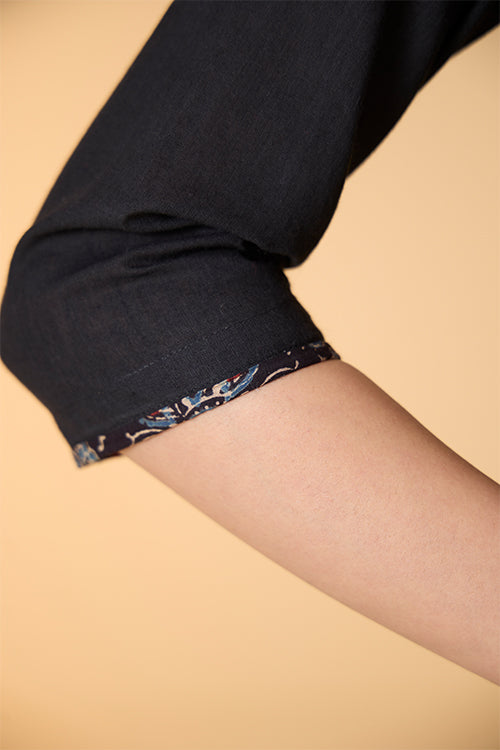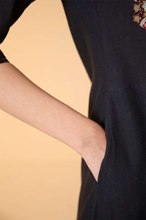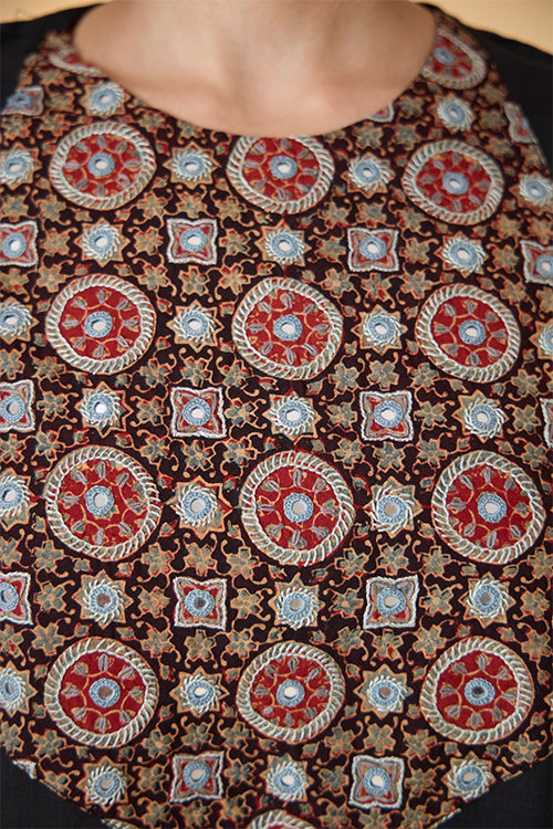 Simple silhouettes paired with the rich heritage of craft takes shape of our "Maya" Kurta. Handcrafted from soft pure cotton, this A-line kurta features stunning hand embroidery with buttonhole, stem, laisy daisy stitches and mirrors on the Ajrakh printed yoke front. Minimal wooden buttons are present at the back for added closure, while 2 pockets on the sides provide you with space to keep your phone or keys. Elegantly flowing, this kurta has no slits so you can wear it simply as a dress or pair it with a contrasting pair of pants. Add on a pair of statement jhumkas and juttis and you are on your way in your best ethnic flair!