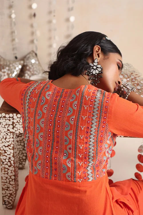 Radiate festive charm with this stunning orange kurta pant set, beautifully handcrafted with intricate embroidery on the front and back yoke. The embroidery features traditional bavadiyo, satin, stem, and running stitches, accentuated with round mirrors that add a subtle shimmer. A delicate line of bavadiyo and running stitches enhances the sleeve edges, giving it a refined finish. The yoke is thoughtfully designed with a double-layered fabric for added structure and comfort. The matching pants come with pockets on both sides and an elasticated back waistband to ensure the perfect fit. Perfect for festive celebrations, traditional gatherings, pujas, or cultural events — this ensemble effortlessly blends handcrafted artistry with contemporary comfort.