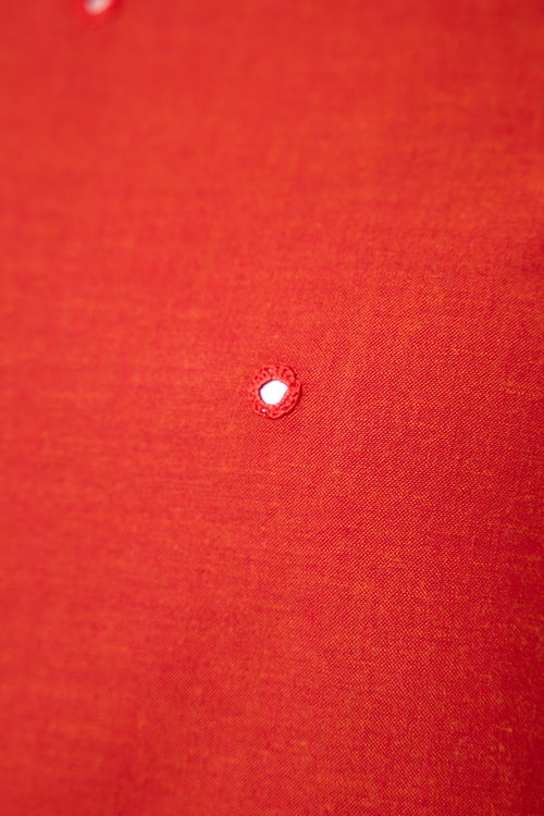 Bold, vibrant, and exotic, our "Nutmeg" straight kurta checks all the right boxes for the perfect kurta. Handmade from pure cotton, the bright orange fabric has mirrors scattered in the front, on the sleeves, and at the bottom back. Extremely soft and comfortable to wear, the kurta comes with shoulder straps with press buttons and 2 slits. Slide in your phone or keys into the 2 handy pockets on the sides. Be it at work or an event, pair with your favourite pair of jeans or beige straight pants- that's how versatile "Nutmeg" is!