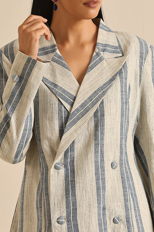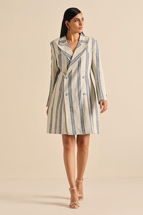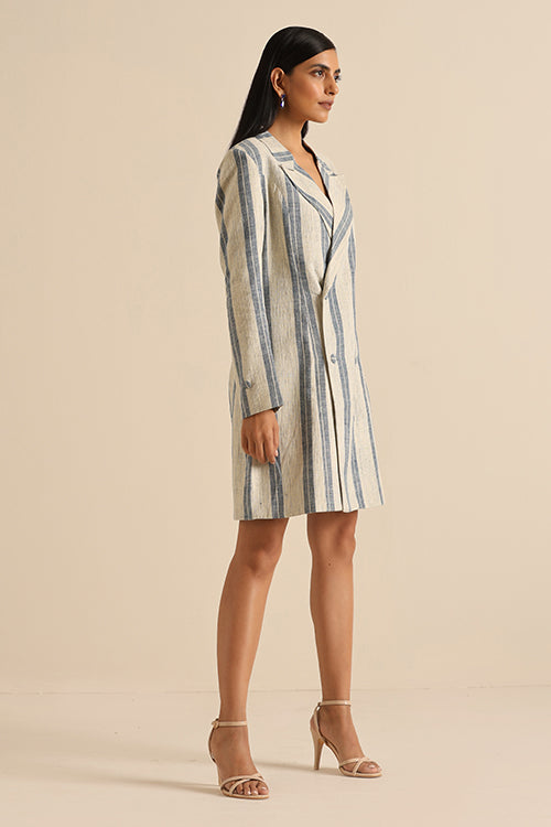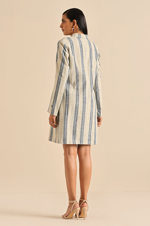 Prim & Proper, yet 'Poise'. Introducing, the 'Poise' blazer dress crafted with pure cotton fabric. We've added two pockets on the sides for the utmost comfort, along with buttons for closure in the front and at the edge of the sleeves. Felt has been added on the shoulder to give you the perfect fit. The subtle hues of white & blue stripes make it possible to ace the confident look when you can't bear pants in this heat! We've designed it in a way that it's summer-friendly and can be worn throughout the seasons. Additional slips ensure the utmost comfort & functionality. Pair it with sneakers or heels with your favourite pair of statement earrings!