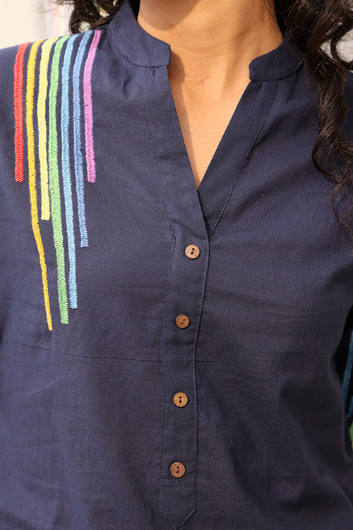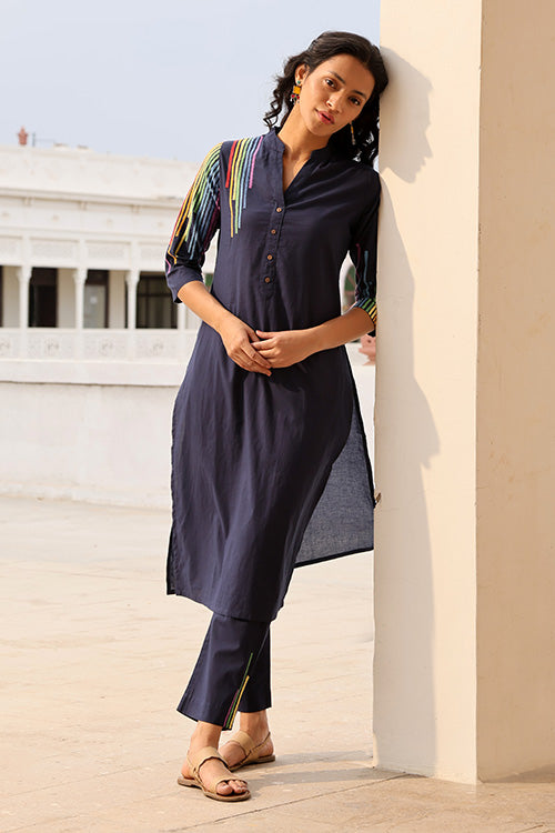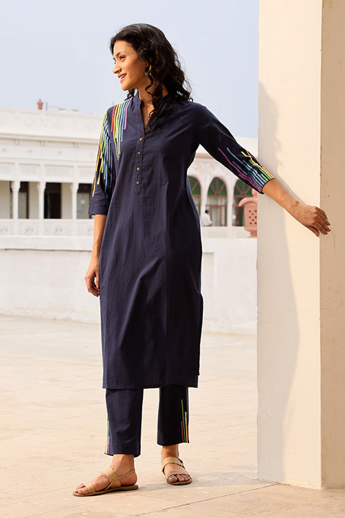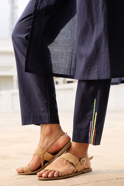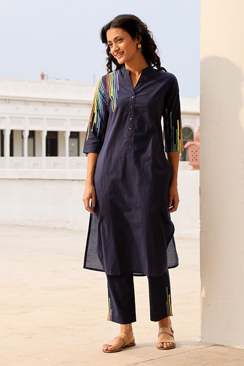 Feel the embrace of a rainbow as you put on this pure cotton Kurta Pant set. Patiently hand embroidered lines in Vibgyor pattern run along the front shoulder and on both the sleeves of this indigo kurta using satin stitch. Show buttons on the placket add to the overall chic and composed look. To provide you with ease of movement, the kurta has two slits on the sides. The set comes with a pair of straight pants with similar Vibgyor lines hand embroidered at the bottom of the pant. And worry not, the pant is equipped with 2 pockets on the sides for you to slide your hands into or to keep your phone in. Gift yourself this set and make a statement every time you wear it!