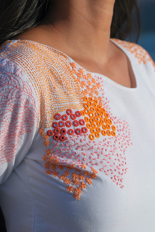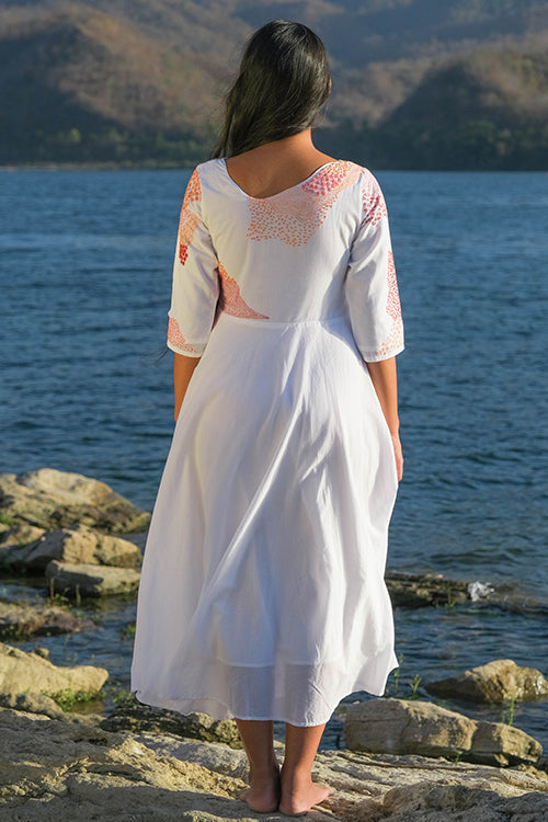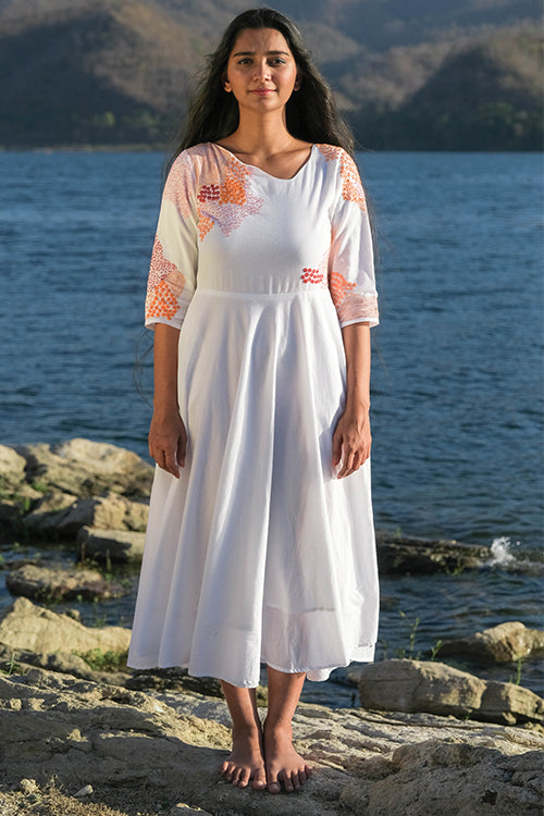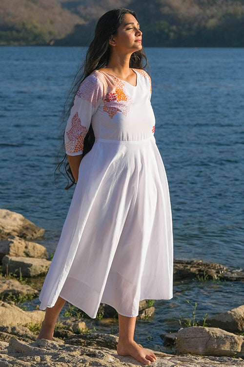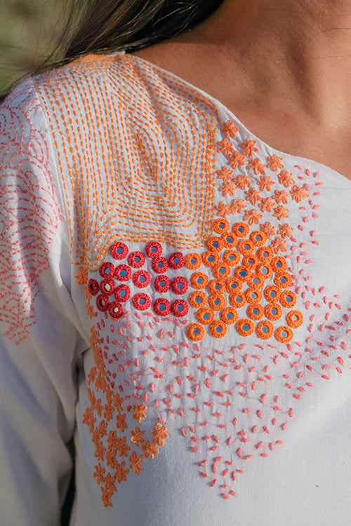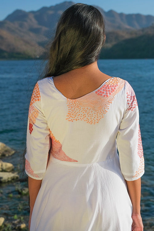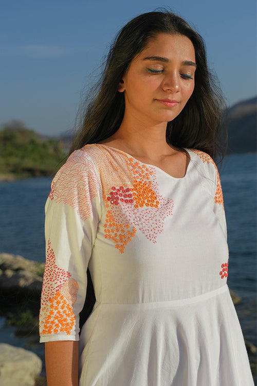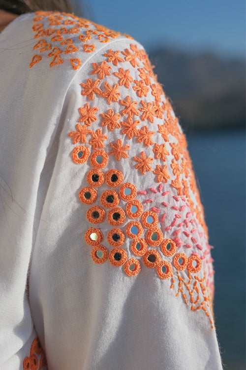 There is something about uneven unique necklines that is so desirable, wouldn’t you agree? We are head over heels in love with our ‘Riverside’ dress that is oh-so-delicious! Feel the handcrafted love in this pure cotton dress that has stunning embroidery along the front yoke, back yoke and even the sleeves with running, lazy daisy, back and rice stitches. Not to miss out on the additional mirror work which adds the sparkling element. This flirty frock dress comes with two pockets so you can dance away carefree at the Holi jamboree!