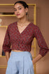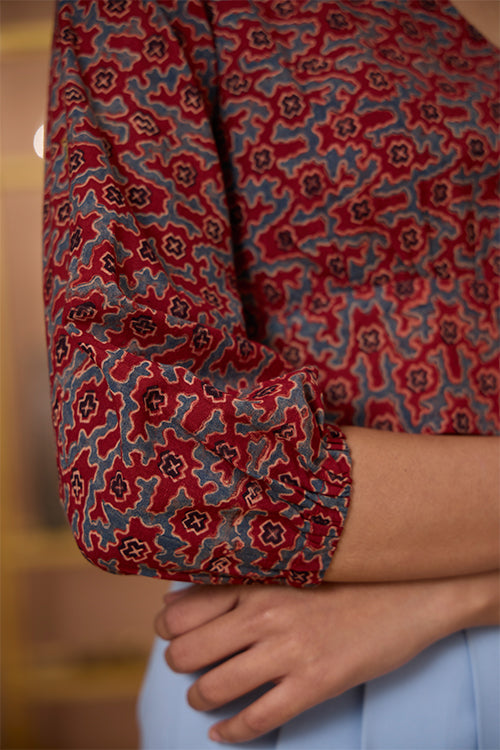 Repurposing traditional tales of Ajrakh printing techniques for the modern woman, we introduce you to our pure cotton "Scarlet Haze" Top. A silhouette that flatters your figure, this V-neckline top comes with a broad belt-type waist. Minimal wooden buttons are provided in the front placket. A mesmerizing pattern that gets you hooked, it runs horizontally in the front, back, and on the sleeves; with vertical prints around the waistband. The elastication on the edge of the sleeves gives it an elegant puffed effect. Put on a dark pair of pants, some statement jewelry, and a sling bag- and you're set to look fabulous!