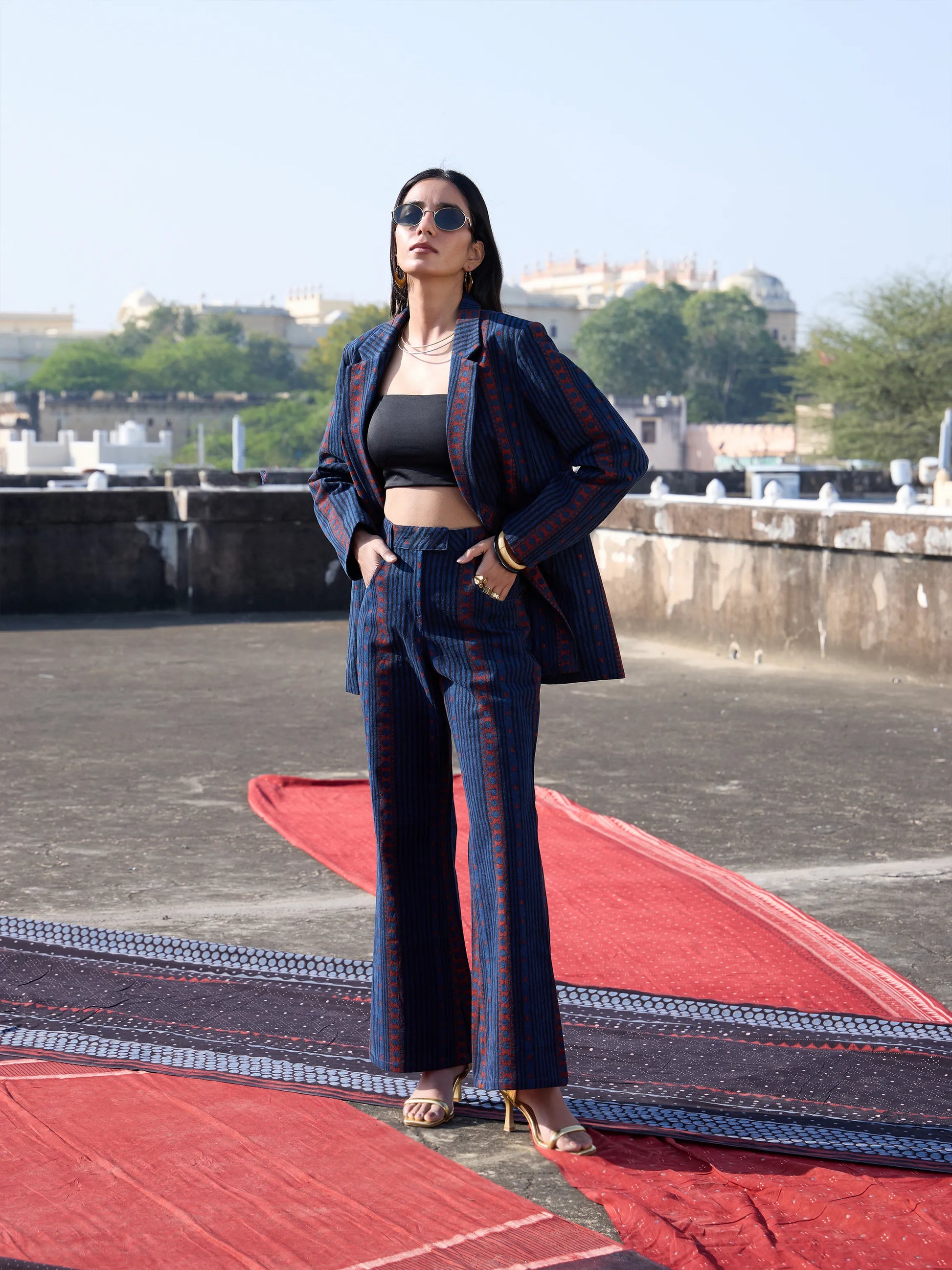 Rooted in the legacy of Ajrakh, this indigo cotton twill blazer reimagines traditional craft in a contemporary silhouette. The deep indigo palette and intricate motifs create a subtle yet striking visual. Designed with front flap pockets, a comfortable lining, and wooden button closures at the front and cuffs, it balances structure with ease. Perfect for creative spaces, cultural events, and refined everyday wear. Style it over dresses, kurtas, or shirts with trousers, denims, or skirts for a look that moves seamlessly across occasions.