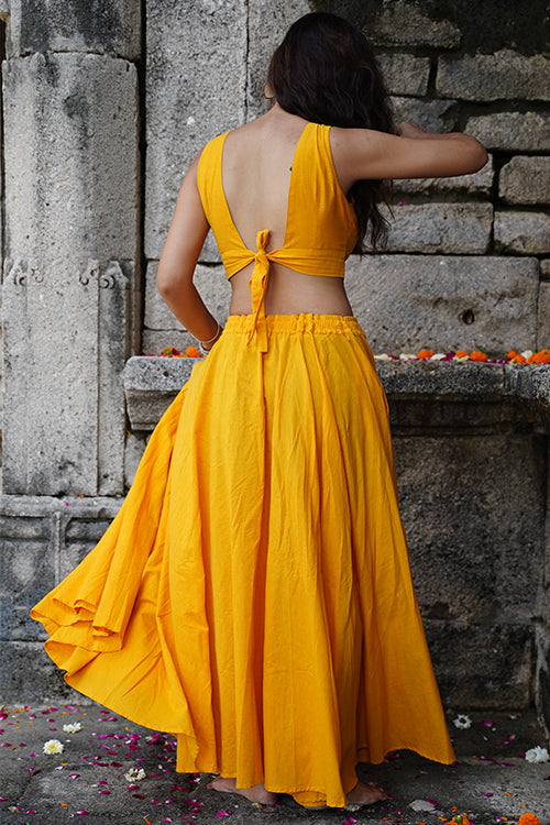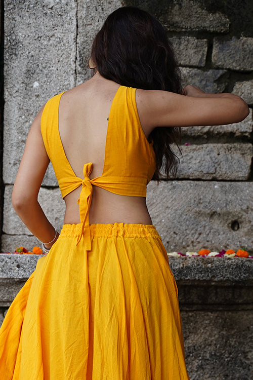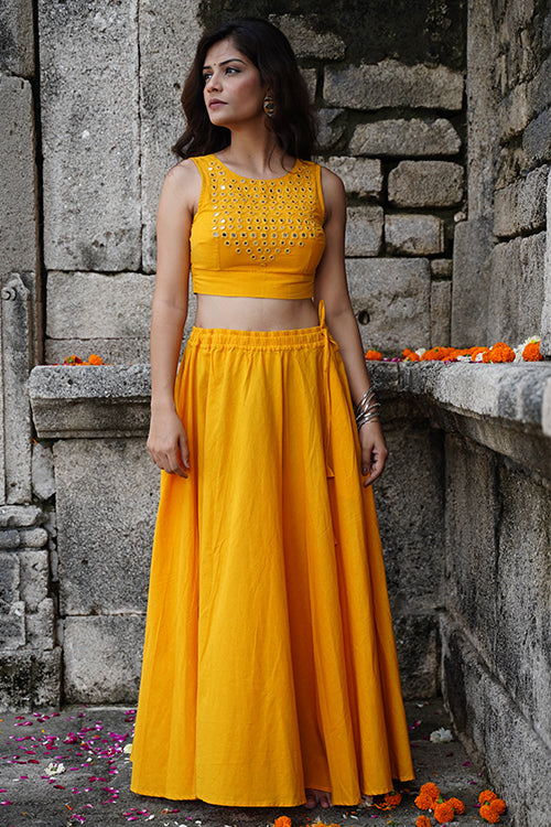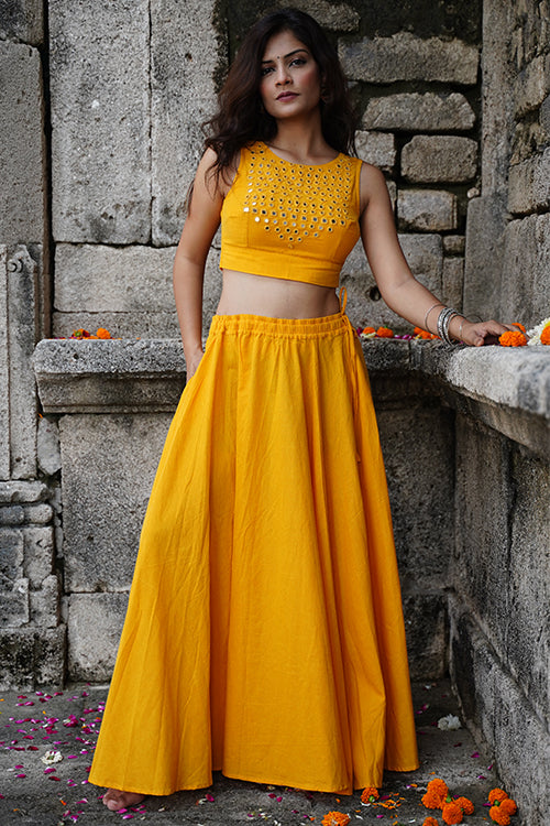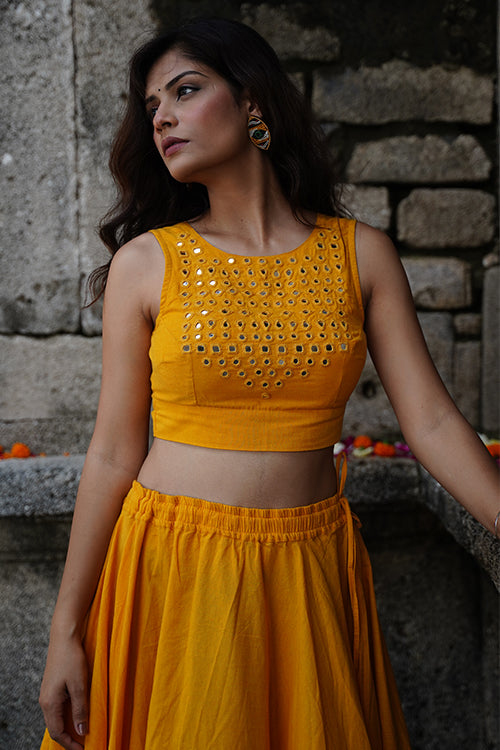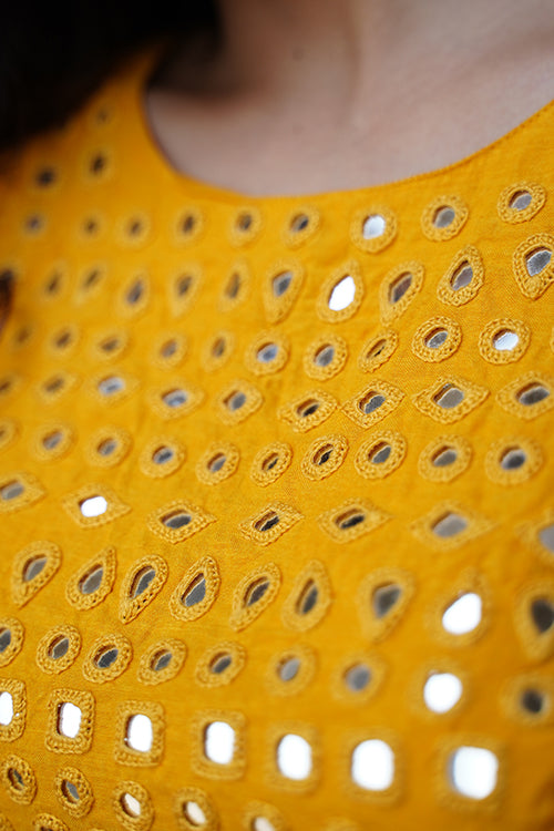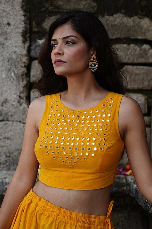 Radiate in the warmth of the "Sunshine" blouse, a sleeveless ode to elegance crafted from pure cotton in a joyful yellow hue. The double-layered fabric offers structure, while an array of mirrors—round, square, kite, and almond-shaped—dance across the front yoke, reflecting light with every move. A belt tie at the back ensures the perfect fit, adding a touch of ease to its tailored charm. Style it with flowing skirts or high-waisted trousers, and let the sparkle of the mirrors pair seamlessly with our handcrafted jewelry for a festive look that turns heads with its effortless grace.
