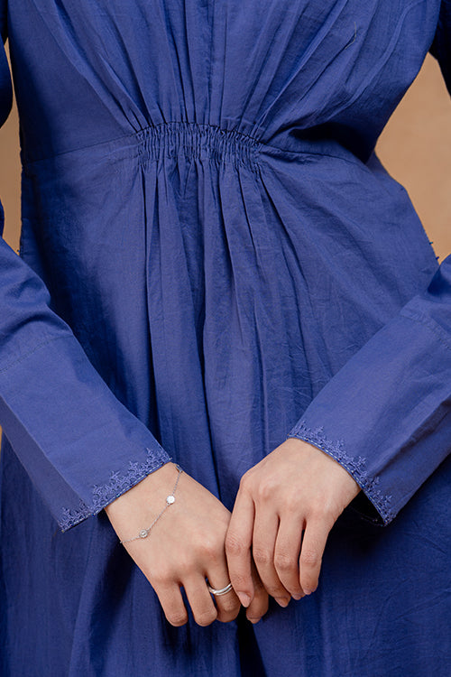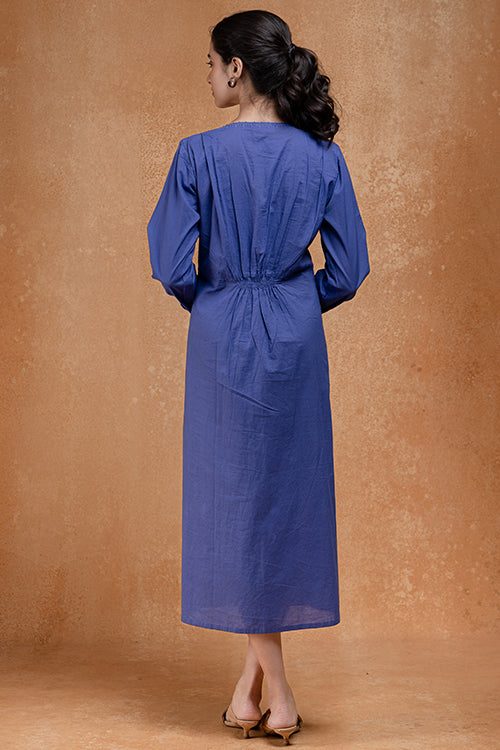 Elegance reimagined in the shade of purple and in the calming touch of pure cotton, "Yahirah" is going to be your new treasured wardrobe item. This majestic V-neckline dress comes with bobbin elastication on the front and back waistline to give the gathered fabric look. The shoulder pads provided lend that chic and smart factor to the overall look. Slide your hands into the 2 pockets on the sides, looking like the boss lady you are. Taking this beyond the ordinary level is the meticulous Bavariyo embroidery with beads entwined through running stitches on the front and back neckline, on the edge of the sleeves, and of the pockets. The minimal wooden buttons on the cuff of the sleeves tie it all in. The perfect transitional dress from a meeting to a party, put on a statement silver neckpiece and heels. Add "Yahirah" to your wardrobe and channel your inner charisma!