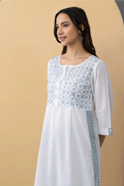 Milky white soft cotton straight kurta featuring contrast light blue chikankari embroidery on the yoke . finished with subtle blue check trims along the sides adding a crisp contemporary touch .