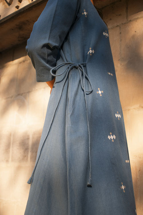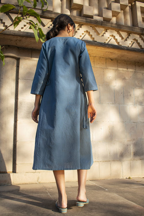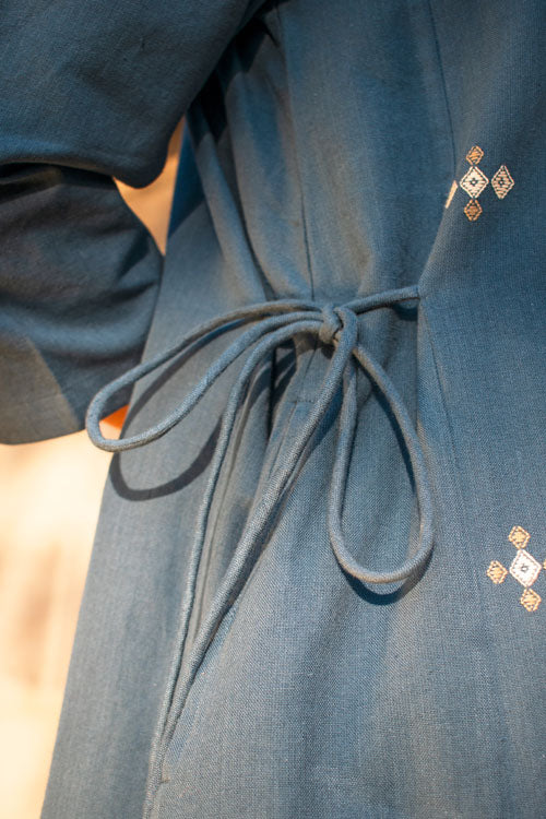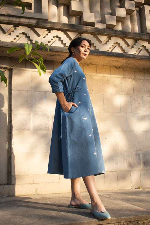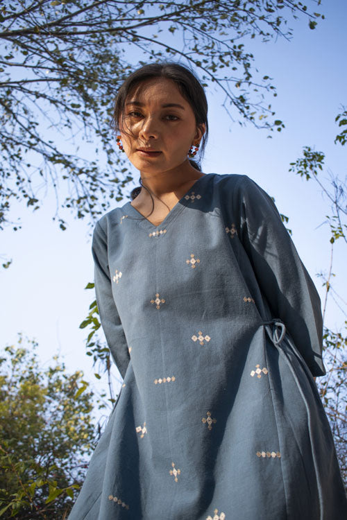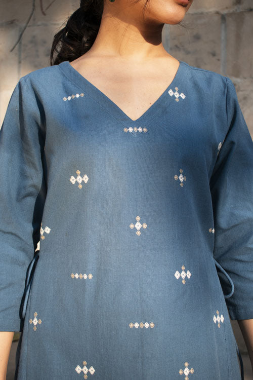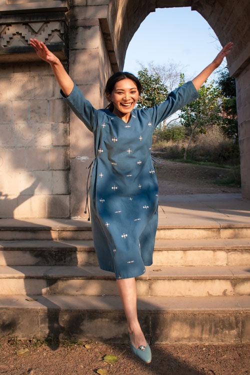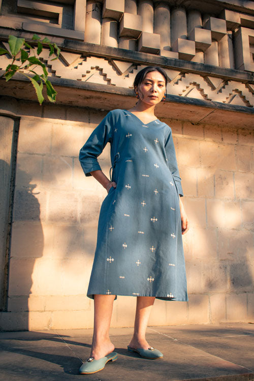 Akriti Extra-weft V neck dress cum kurta in Blue. This versatile dress whivh can be worn as a kurta features all-over handwoven extraweft motifs on the front panel, adding elegance to your look. With drawstrings on the side for a customizable fit and flare, and pockets for convenience, it's perfect for office wear or outings. Comfortable and chic, it effortlessly combines style and functionality. This dress holds a special touch as artisans from rural Barmer in Rajasthan have hand woven it specially for you.