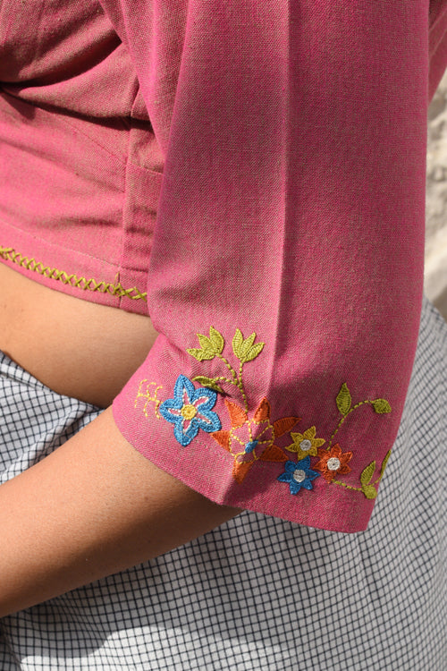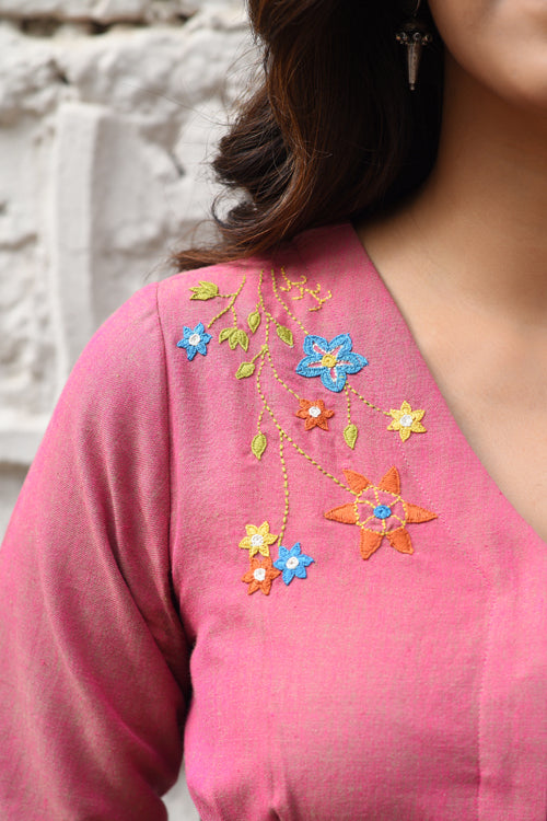 The Cheenth Pink Fitted Cotton Blouse, made from 100% cotton, offers a great fit. Designed with a flattering V-shaped neckline and front hooks for closure, this blouse ensures both comfort and style. Front pleats shape the bust while a band cinches at the waist for a perfect fit. Featuring intricate pucca embroidery around the sleeves and engineered placements in the front, the designs remain visible even under your drapes. Pucca embroidery from Rajasthan, known for its use of elongated square chain, double buttonhole, and satin stitches, contrasts the starkness of the desert with vibrant colors, showcasing traditional craftsmanship.