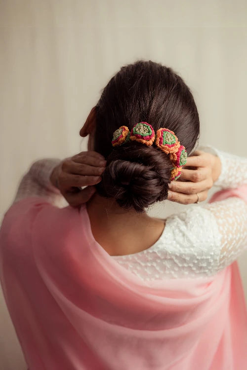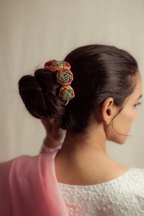 There’s a quiet romance in the way flowers have always found their place in our lives, tucked into braids, worn at celebrations, offered in prayer. Our gajra is a tribute to that enduring tradition, inspired by the floral adornments cherished by women. Every flower is shaped and strung by hand, crafted with the same care that goes into age-old rituals of beauty and belonging. You can wear it in your hair, wrap it around your neck or wrist, or drape it gently on a bun however, you choose, it carries with it a whisper of heritage, softness, and everyday poetry.