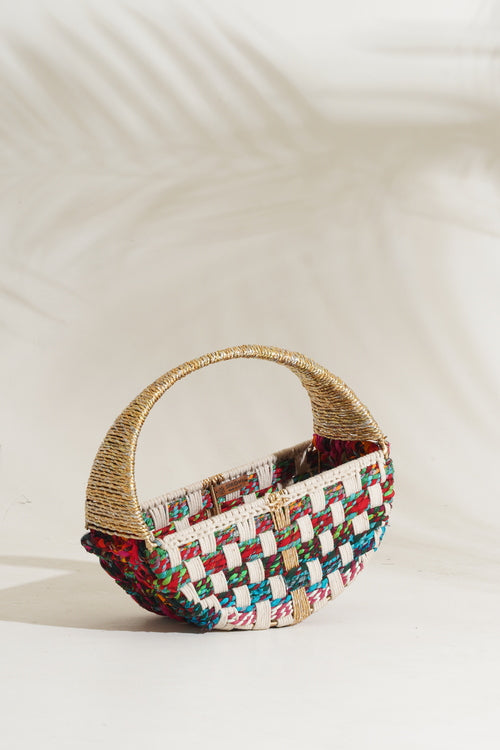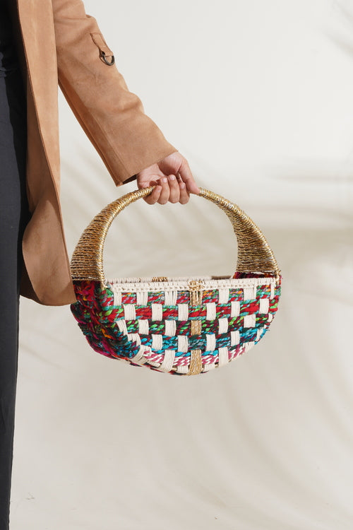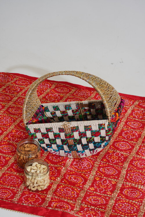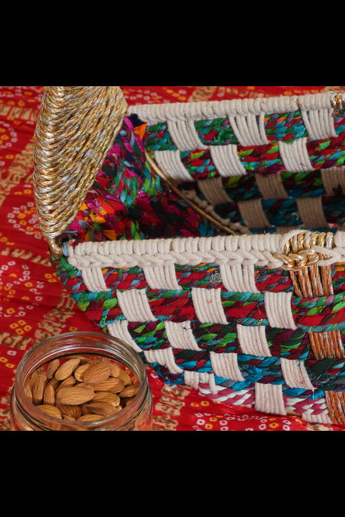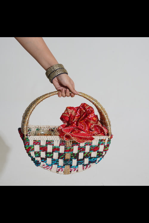 Handwoven with colourful upcycled textile waste ropes on a sturdy iron frame, this little basket is the most adorable sustainable home decor item you can have! Its handle has been delicately woven using bold gold ropes made from upcycled plastic waste. Use it to keep your essentials on the bedside or home offices as a desk accessory or make beautiful gift hampers- the possibilities are endless!