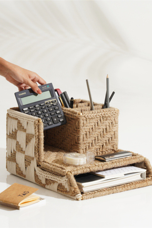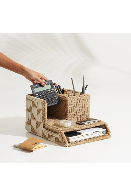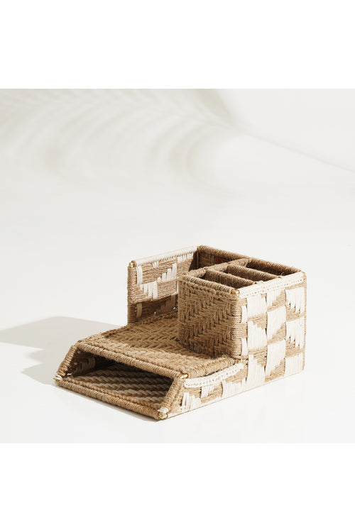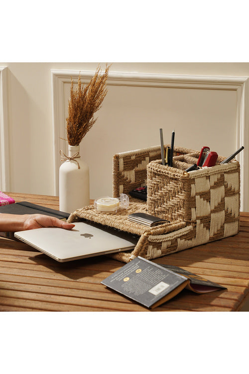 Discover the perfect blend of style and functionality with our handwoven laptop organizer. Made with jute and cotton, this eco-friendly accessory showcases rustic charm and earthy tones. It’s multiple compartments and woven interior ensure optimal protection for your laptop and accessories. Portable and convenient, it's an essential choice for students, professionals, and travelers. Elevate your laptop experience with our artisan-crafted jute and cotton laptop organizer.