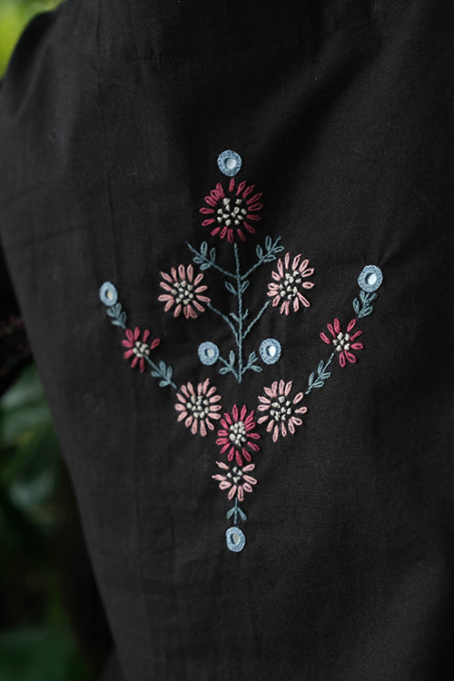 Be it a warm winter or a delightful summer evening, our black 'Sombre' kurta and pant set will come in handy for any special occasion. A heavily embroidered floral yoke with mirrors intricately adorns the kurta arranged in a beautiful pattern, reflecting soft femininity. It is further decorated with embroidery and mirrorwork at the back. The kurta also has shoulder loops with press buttons and two slits for convenience. We've also added embroidery on the sleeves to accentuate the look. The monochromatic embroidered pants that come with the set feature concealed pockets and elastication at the back added comfort.