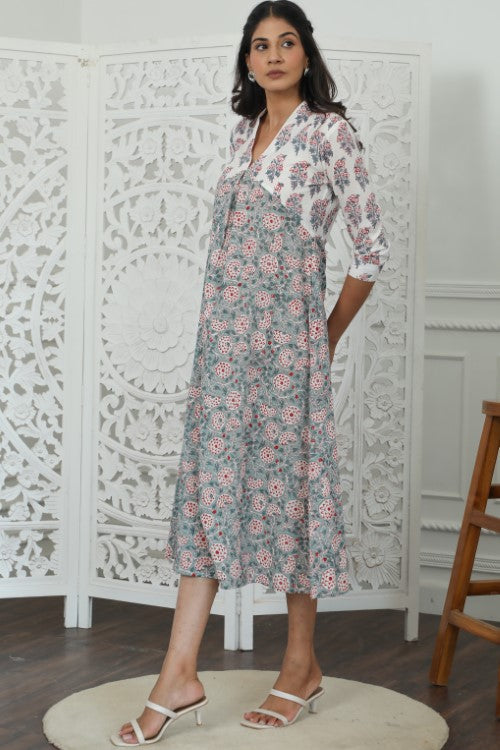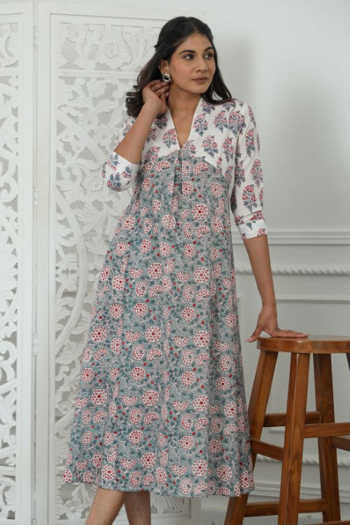 The highlight of this dress is its stunning hand block prints, meticulously crafted by skilled artisans to create a unique and eye-catching design. The pure cotton fabric ensures that the dress is breathable, lightweight, and comfortable to wear, making it perfect for daily wear or casual outings.