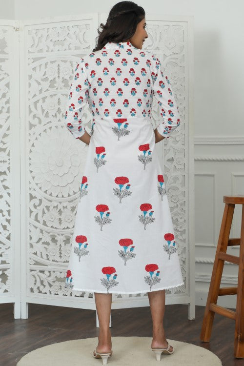 The highlight of this dress is its stunning hand block prints, meticulously crafted by skilled artisans to create a unique and eye-catching design. The pure cotton fabric ensures that the dress is breathable, lightweight, and comfortable to wear, making it perfect for daily wear or casual outings.