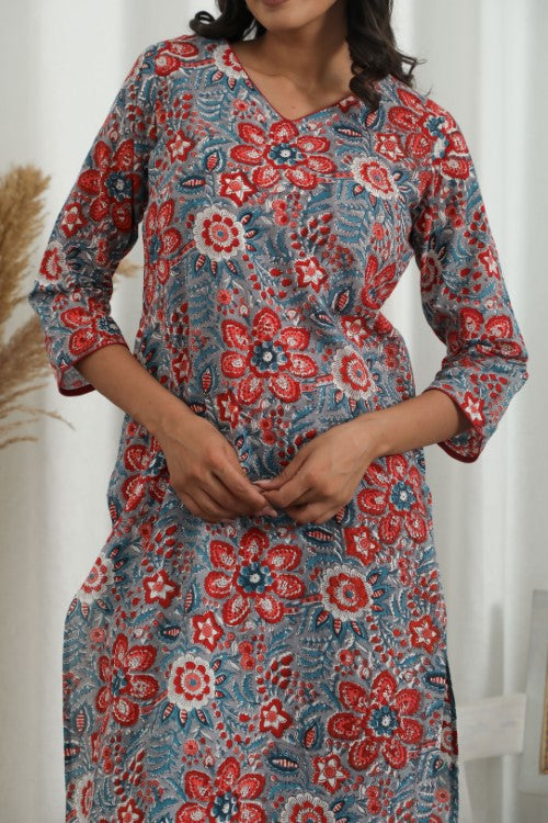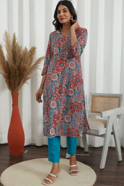 Transform your look with our ' Radiant Vibes ' Azo-free Hand block Printed Pure Cotton Kurti. This stunning piece is made from breathable cotton, providing comfort and style all day long. Handcrafted by skilled artisans, every detail is infused with traditional craftsmanship, featuring a beautiful leaf design .adorned with striking blue and red hues, offering a perfect blend of traditional elegance and contemporary style. The eco-friendly color dyes used for further demonstrate our dedication to ecological quality in our products. Don't wait to add this essential piece to your wardrobe!