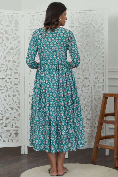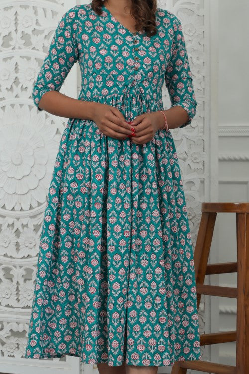 Experience the missing piece in your wardrobe with the floral beauty of Sootisyahi's cotton dress. Meticulously crafted for optimum comfort, this dress features a smart color-blocking design and vibrant floral prints in a multi-coloured combination. Whether you're working or relaxing, choose this breathable dress for a full day of comfort. Complete the look with block heels or flats, a sling bag, and set out to have a wonderful day. Made from azo-free hand-block printed fabrics, this dress reflects our commitment to ecological quality and exudes confidence.