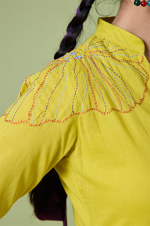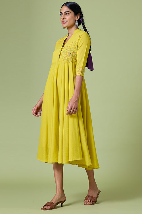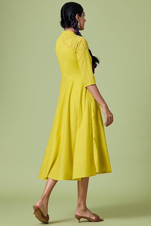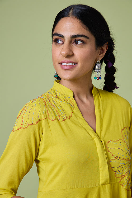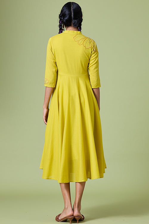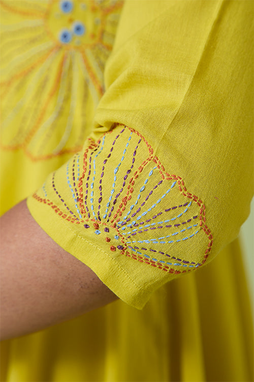 Summer Love' is a must-have for the sophisticated and stylish woman. It is carefully crafted with 100% cotton, ensuring a comfortable fit and all-day wearability. This yellow dress has a classic style that makes it suitable for the summer season. Made from a stunning fabric and lined with softest mul fabric it’s made to inspire confidence and compliment your body type perfectly. The functional front placket, additional belt and two pockets on the sides ensures utmost comfort. The embroidery speak of the spring dance, the return of blooming flowers. Just as how you're going to feel as you put on this dress, carrying a spring your own little spring garden! It also has 2 pockets for your essentials. The perfect blend of comfort and style, 'Summer Love' is great for the workplace or a casual outing. Wear it with heels or flats and you’re ready to go!