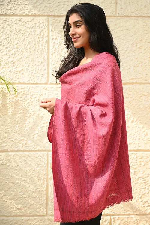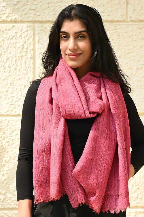 Fine, Soft Himachal Wool Self Striped Plain Stole - Rosy Stripes. A versatile winter accessory, cherished for its soft warmth and an understated elegance, is handcrafted with fine wool from Himachal Pradesh. Its feather light weave carries a lasting gentleness — staying soft, warm, and cherished for years, even generations, to come. The extreme cold winters of Himachal have necessitated wool weaving that has evolved into distinct craft forms for each of these states. Nearly every household in Himachal and Uttaranchal owns a pit-loom and wool is considered as pure and also used as a ritual cloth. The well-known woven object is the shawl ranging from fine pashmina to the coarse ‘Desar’ in striking patterns and vibrant colours. There are Central Asian, Rajputana and Tibetan influences in the handloom of Himachal Pradesh. Wool is obtained from migratory mountain goats, angora rabbits, and sheep bred in farms.