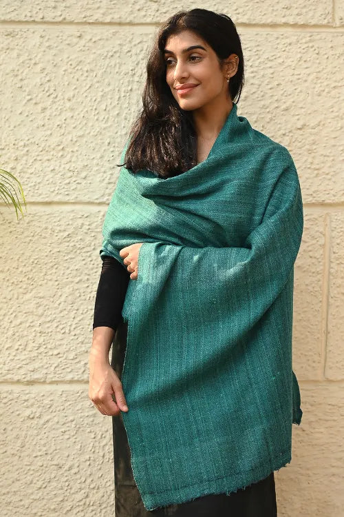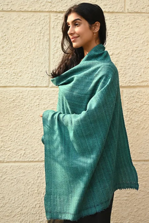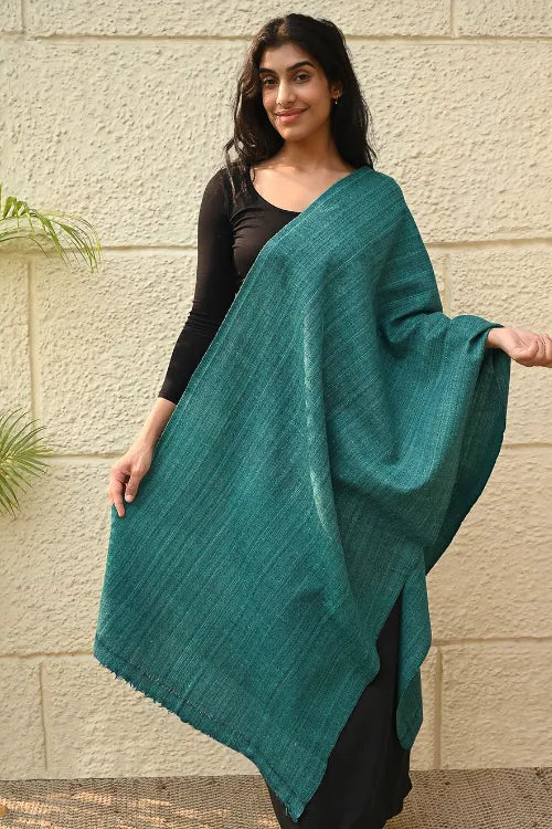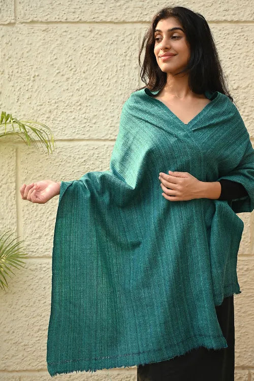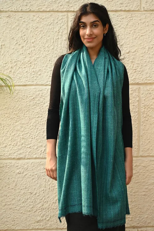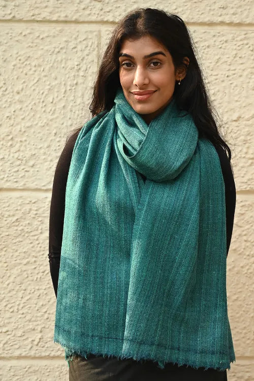 Fine, Soft Himachal Wool Self Striped Plain Stole - Teal Stripes. A versatile winter accessory, cherished for its soft warmth and an understated elegance, is handcrafted with fine wool from Himachal Pradesh. Its feather light weave carries a lasting gentleness — staying soft, warm, and cherished for years, even generations, to come. The extreme cold winters of Himachal have necessitated wool weaving that has evolved into distinct craft forms for each of these states. Nearly every household in Himachal and Uttaranchal owns a pit-loom and wool is considered as pure and also used as a ritual cloth. The well-known woven object is the shawl ranging from fine pashmina to the coarse ‘Desar’ in striking patterns and vibrant colours. There are Central Asian, Rajputana and Tibetan influences in the handloom of Himachal Pradesh. Wool is obtained from migratory mountain goats, angora rabbits, and sheep bred in farms.