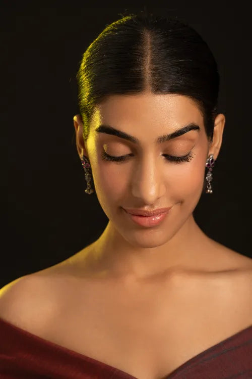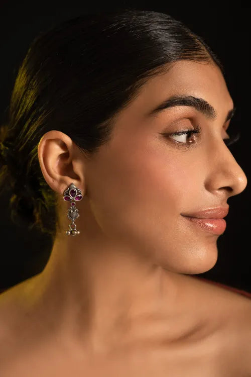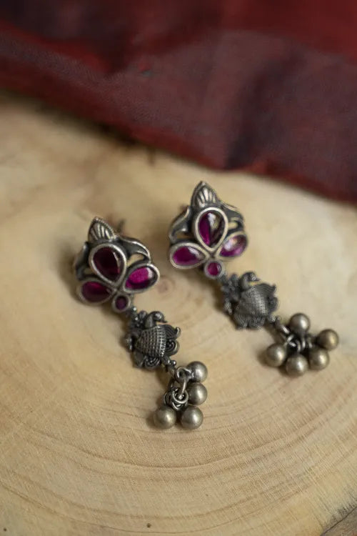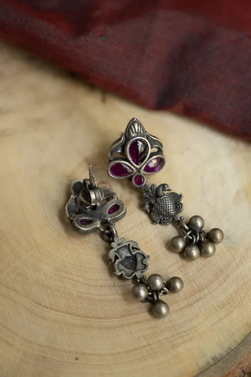 Pure Silver Traditional Maharashtrian Earrings - Shankhpushpi. Bringing together the elegance of leaf-like enamel forms, ornate peacock accents, and the soft chime of ghunghru-inspired beads. With its ruby-hued glass inlays and intricate detailing, it captures the lyrical spirit of classical adornment. This lovely piece has been beautifully crafted from pure Hallmark Silver and stands apart with its unique character. Handcrafted in Kolhapur, these designs have been inspired by traditional Maharashtrian designs. The process for the crafting of this beautiful Jewelry starts with the procurement of raw silver bricks, that are melted and alloyed only after a complete and thorough purity check is conducted on it. This alloy is then pressed into flat and thick wires and further refined to thinner wires depending on the requirements. The beads and small pieces of Jewelry are further crafted by skilled artisans in a precise and painstaking process.