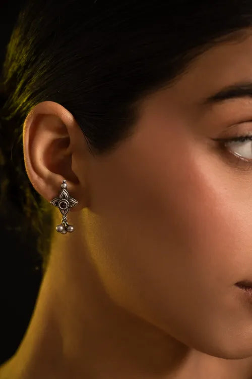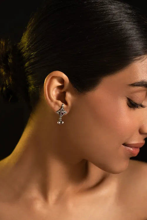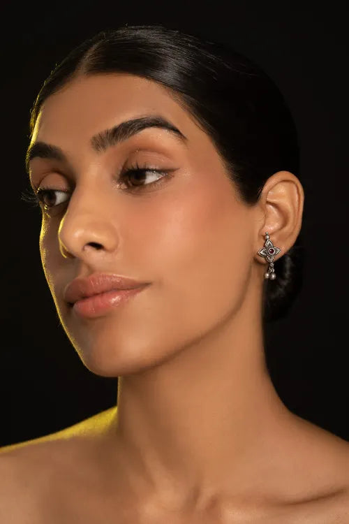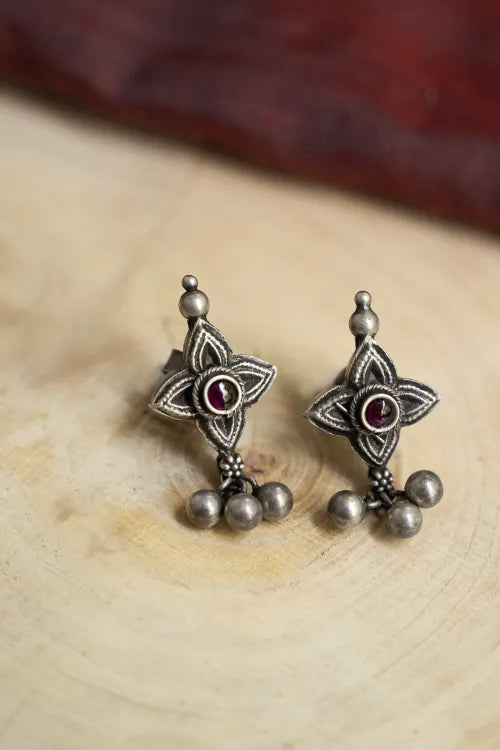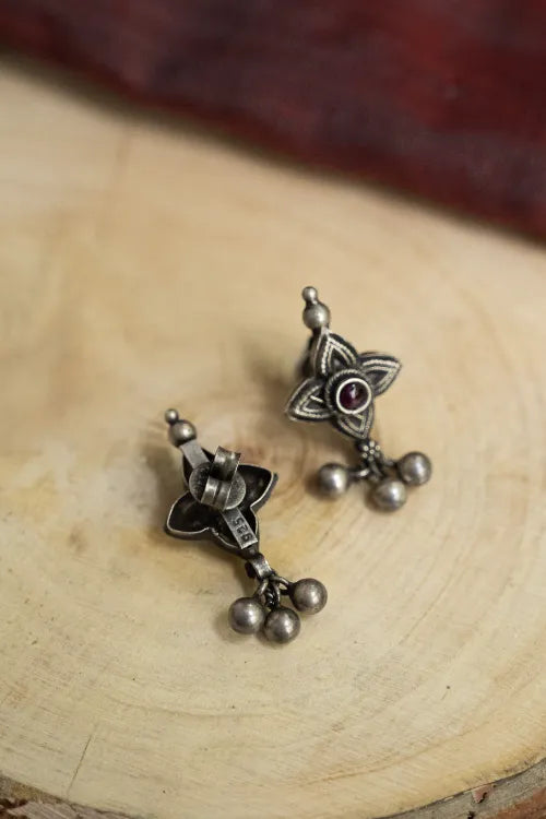 Pure Silver Traditional Maharashtrian Earrings - Tarakini Studs. A nod to celestial grace. A tiny star handcrafted in intricate silverwork, crowned with a deep red stone at the centre. A collector’s piece made for heartfelt heirloom gifting or timeless celebration. This lovely piece has been beautifully crafted from pure Hallmark Silver and stands apart with its unique character. Handcrafted in Kolhapur, these designs have been inspired by traditional Maharashtrian designs. The process for the crafting of this beautiful Jewelry starts with the procurement of raw silver bricks, that are melted and alloyed only after a complete and thorough purity check is conducted on it. This alloy is then pressed into flat and thick wires and further refined to thinner wires depending on the requirements. The beads and small pieces of Jewelry are further crafted by skilled artisans in a precise and painstaking process.
