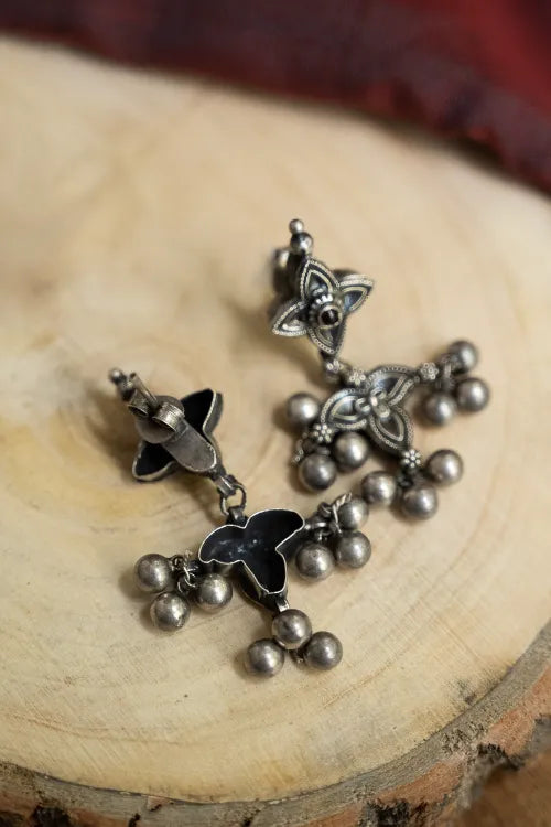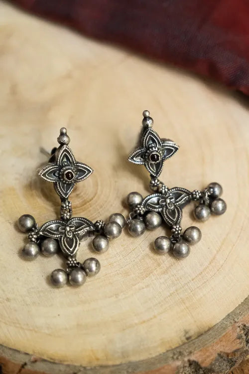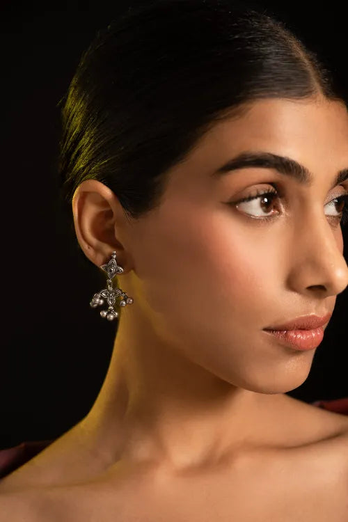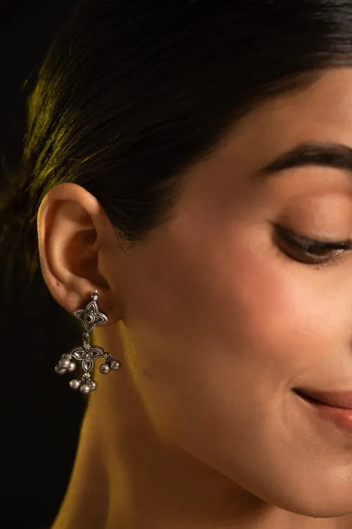 Pure Silver Traditional Maharashtrian Earrings - Taraveli. The quiet shimmer of a star-strewn rhythm- minimal yet intricate peaking volumes of timeless skill. An adornment that carries a distinct heirloom charm with a whisper of old-world allure. This lovely piece has been beautifully crafted from pure Hallmark Silver and stands apart with its unique character. Handcrafted in Kolhapur, these designs have been inspired by traditional Maharashtrian designs. The process for the crafting of this beautiful Jewelry starts with the procurement of raw silver bricks, that are melted and alloyed only after a complete and thorough purity check is conducted on it. This alloy is then pressed into flat and thick wires and further refined to thinner wires depending on the requirements. The beads and small pieces of Jewelry are further crafted by skilled artisans in a precise and painstaking process.
