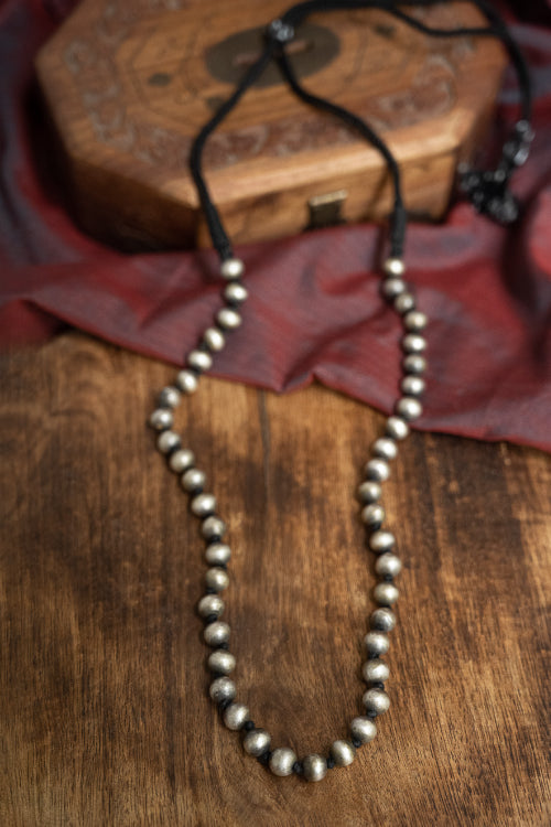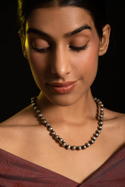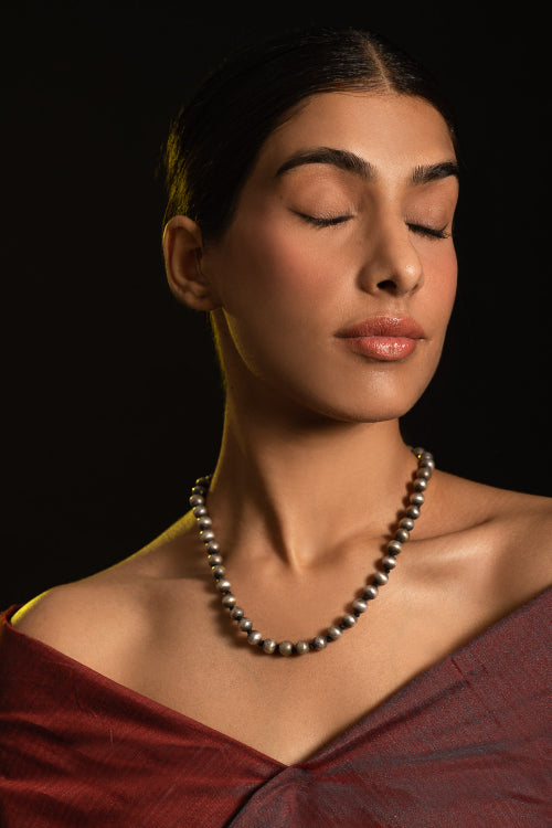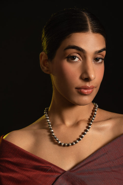 Pure Silver Traditional Maharashtrian Neckpiece - Golmani Saar. Understated yet commanding, this piece is a nod to vintage craftsmanship- A gorgeous string of gently lustrous silver orbs. A timeless adornment that carries a distinct heirloom charm with a whisper of old-world allure. A traditional heritage design, this exquisite piece has been beautifully crafted from pure Hallmark Silver and stands apart with its unique character. Handcrafted in Kolhapur, these traditional Maharashtrian designs were mostly only crafted in pure Gold. The process for the crafting of this stunning Jewelry starts with the procurement of raw silver of bricks, that are melted and alloyed only after a complete and thorough purity check is conducted on it. This alloy is then pressed into flat and thick wires and further refined to thinner wires depending on the requirements. The beads and small pieces of Jewelry are further crafted by skilled artisans in a precise and painstaking process.