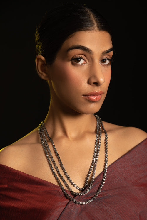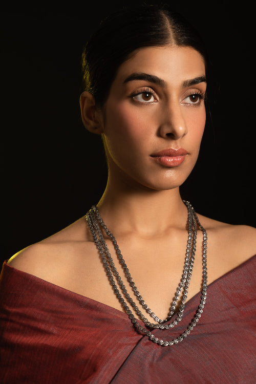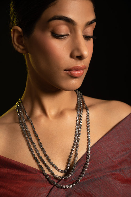 Pure Silver Traditional Maharashtrian Neckpiece - Pohehaar (Tri-String). This piece is a nod to vintage craftsmanship. A cascading tri-layered necklace, handcrafted with gorgeous intricate silverwork. A traditional heritage design, this exquisite piece has been beautifully crafted from pure Hallmark Silver and stands apart with its unique character. Handcrafted in Kolhapur, these traditional Maharashtrian designs were mostly only crafted in pure Gold. The process for the crafting of this stunning Jewelry starts with the procurement of raw silver of bricks, that are melted and alloyed only after a complete and thorough purity check is conducted on it. This alloy is then pressed into flat and thick wires and further refined to thinner wires depending on the requirements. The beads and small pieces of Jewelry are further crafted by skilled artisans in a precise and painstaking process.