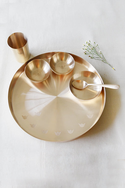 The Tulsi Kansa Thali/Platter is our signature piece in the 2015 Metal Eclectic collection. It embodies our quest to seek tradition and interpret it for this day and age. The Platter will enhance your festive meals and is also said to be healthy for everyday use. Use for dining. Elements of the 1 Thali Set consisting of the following 6 pieces -